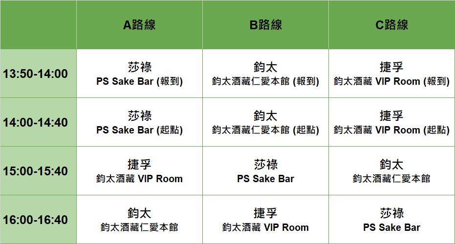 - 請於活動當日13:50前往路線起點報到,14:00開始首場品酒會