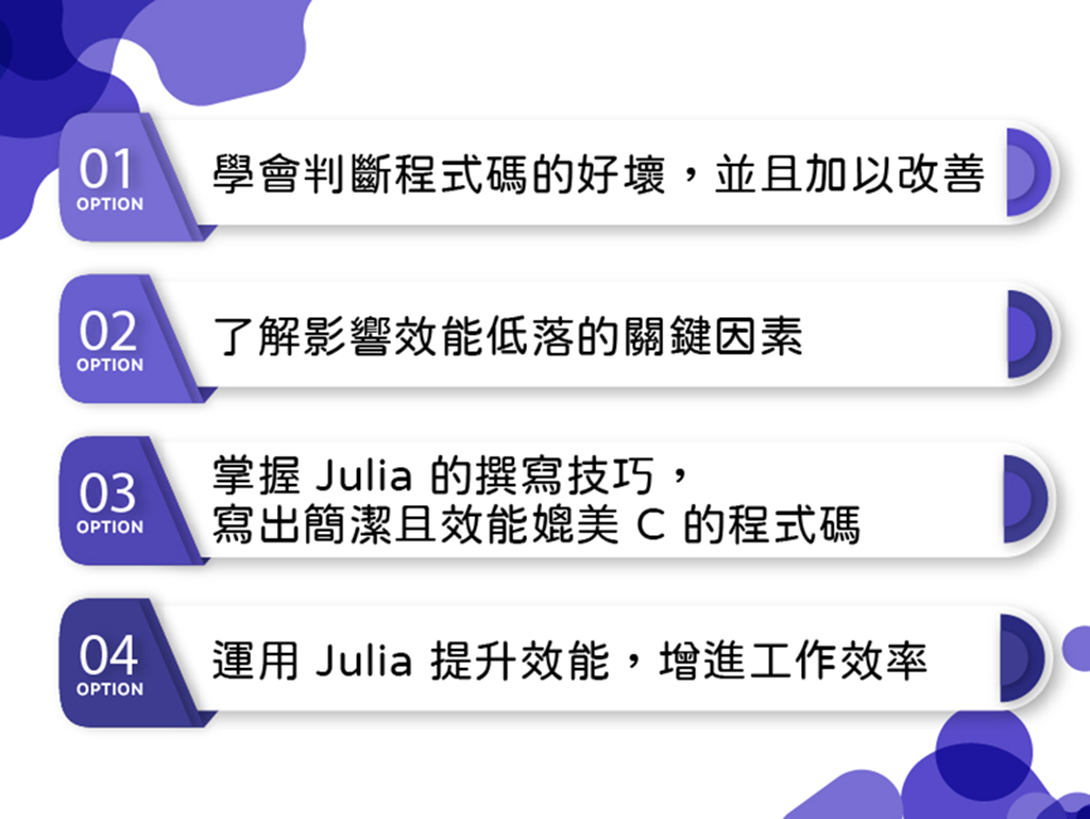 - 如果你對於資料科學有興趣,還在猶豫要用 Julia 或是 Python 開發,或是你已經使用 Julia 進行繁重的數學運算,工作坊將能提升你 Julia 的撰寫技巧!