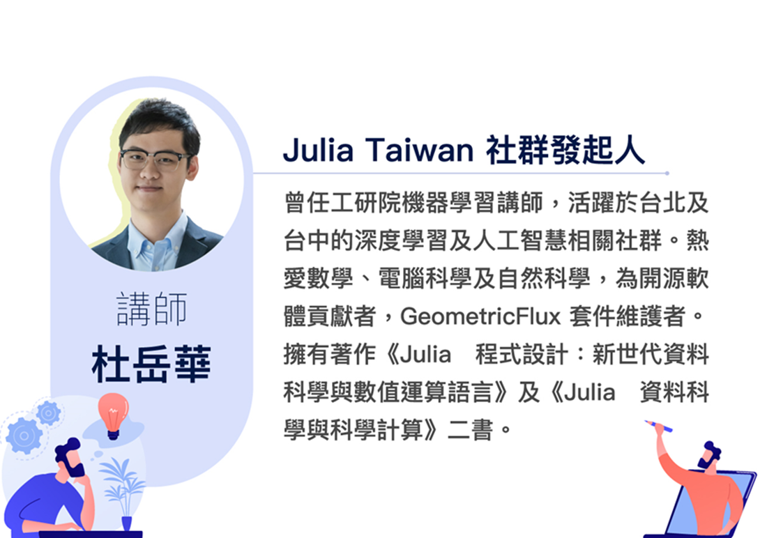 本次工作坊邀請 Julia 台灣的發起人:杜岳華來為大家授課,完整 6 小時的紮實訓練,手把手帶你調教程式碼效能,讓你掌握 Julia 的關鍵開發技巧。工作坊將以線上直播的方式進行,課前會先提供教材與範例程式碼,讓你可以在上課中同步操作。如課後有問題想詢問專家,Cupoy 問答網站永遠協助您找到適合的專家為您解答;如課後想要再次進行複習以及索取簡報,僅提供參與「AI工程師全系列養成計畫」用戶永久觀看。(計畫詳情請至「活動注意事項」)
