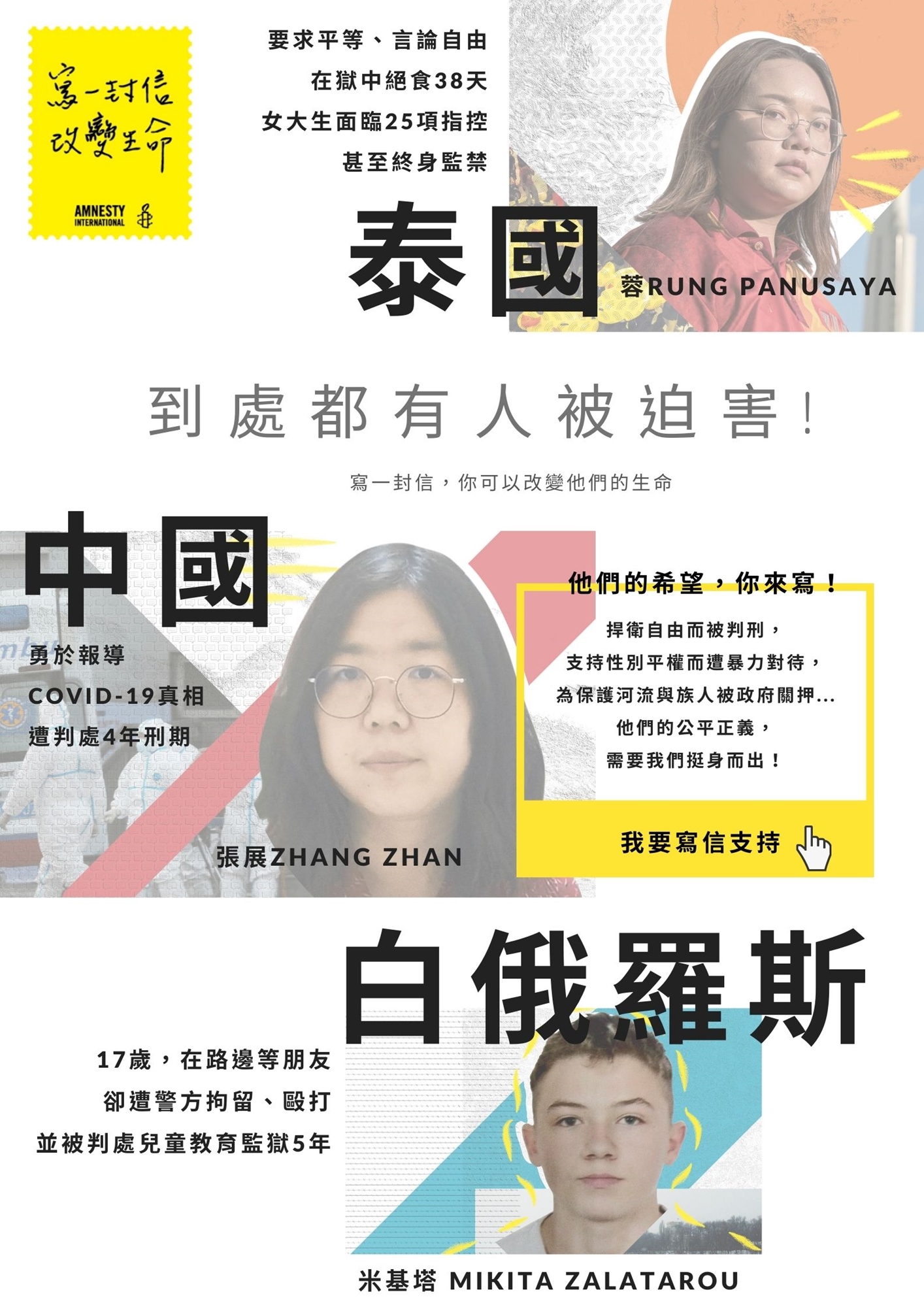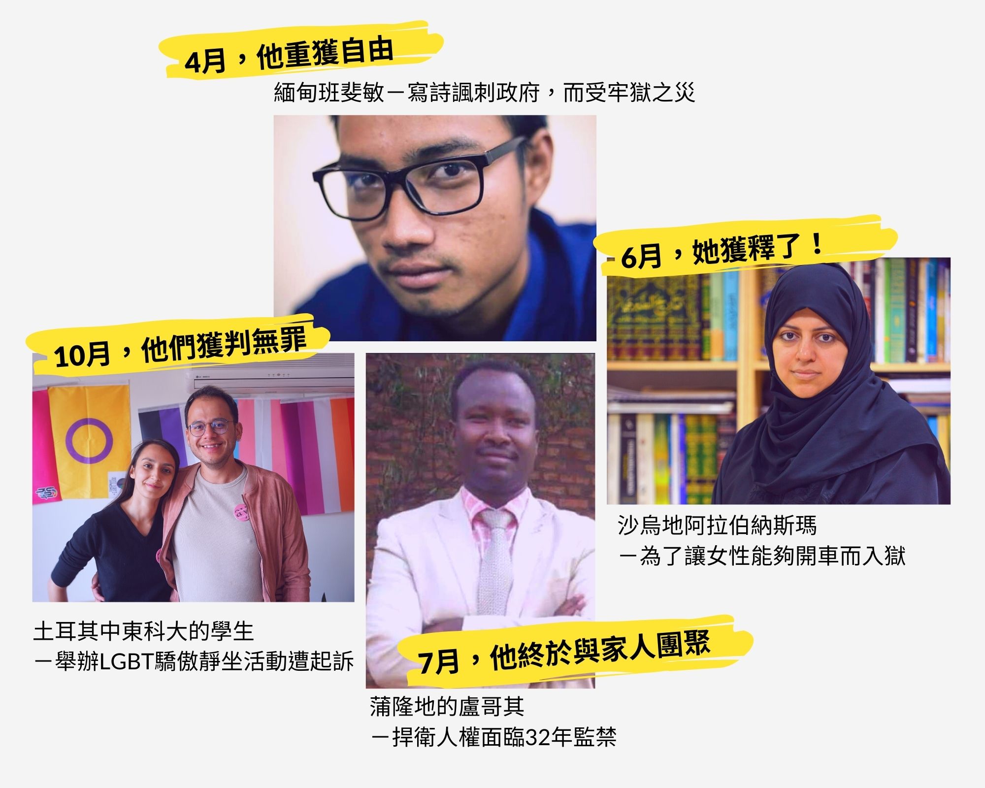 有的人因為捍衛自由而被判刑、有的人因為支持性別平權而遭到暴力對待,有人因為保護河流與族人被政府關押。我們可以為他們挺身而出,寫一封信,鼓勵這些人權捍衛者們,或是向該政府施壓。