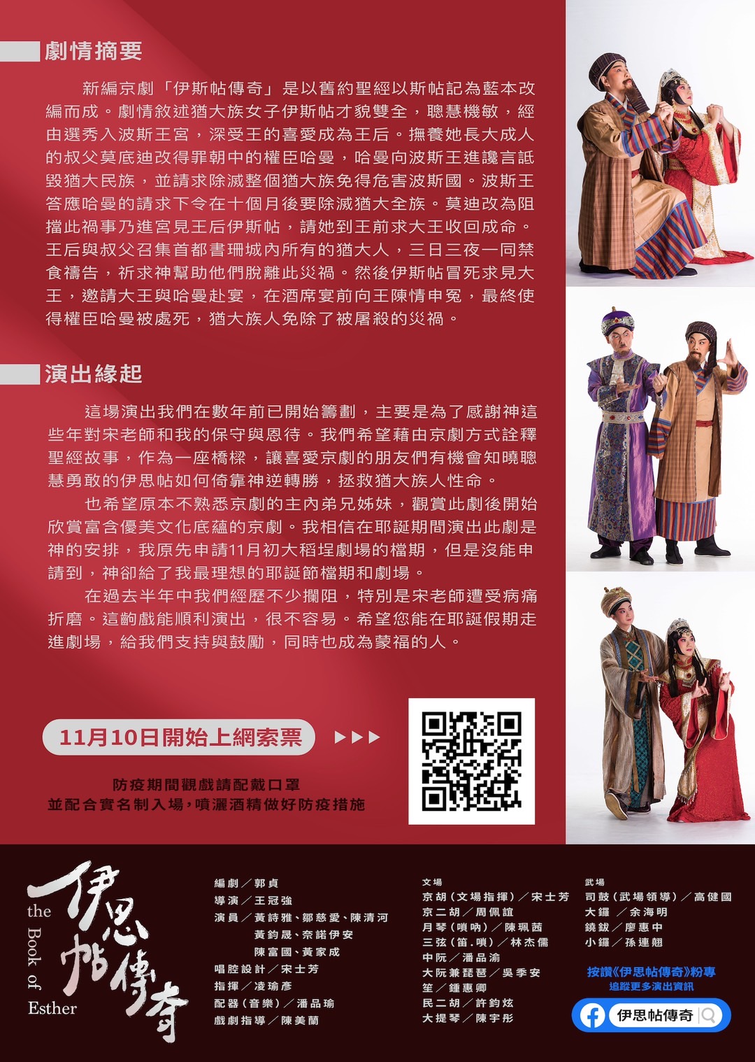 推薦序--新編京劇「伊思帖傳奇」是以舊約聖經以斯帖記為藍本,改編而成。這在台灣屬於首創。本劇的製作人及編劇郭貞教授期望這是一次高水平的專業演出,邀得名滿兩岸的京胡演奏家宋士芳負責唱腔設計,並擔任文場領導,與水平一流的國光劇團樂隊通力合作。同時邀得國光一等導演王冠強先生執導,參與演出者均為國光劇團的優秀演員,陣容堅強,值得期待。