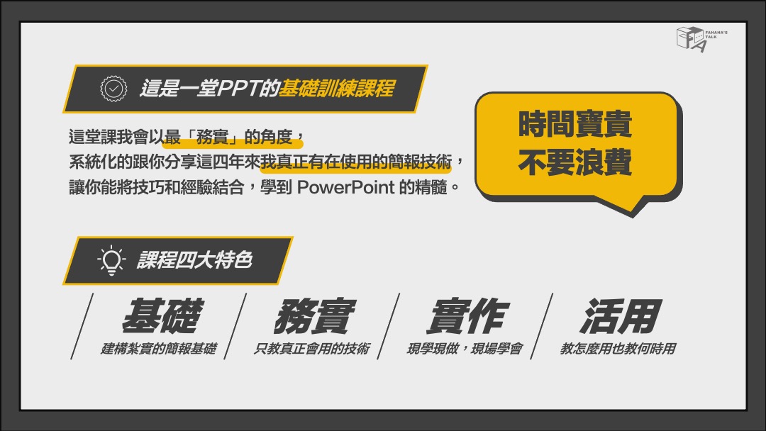 A:不會。這堂課最主要是在幫你建構紮實的簡報基礎,包括PPT系統、形狀、線條、文字、圖片之間的靈活運用...等,只有等這些技能你都活用,才有辦法應用設計的觀念。如果你對簡報設計有興趣,也歡迎你參考我這門課的一對一教學【簡報邏輯設計課】。