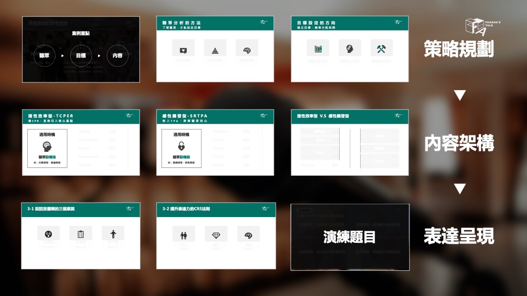- 內容架構篇:建立邏輯架構的方法、兩大表達模組、演練與回饋