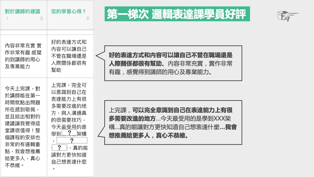 - 不會著重在「記憶」表達公式,而是真正掌握優質表達的底層邏輯