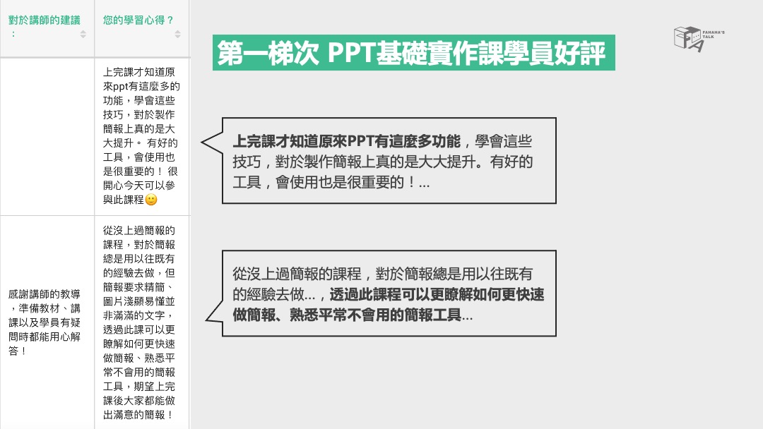 除了團體工作坊的教學,去年(2020)七月開始,為更了解各領域簡報學習者的需求與困擾,開啟了一對一的教學計畫。