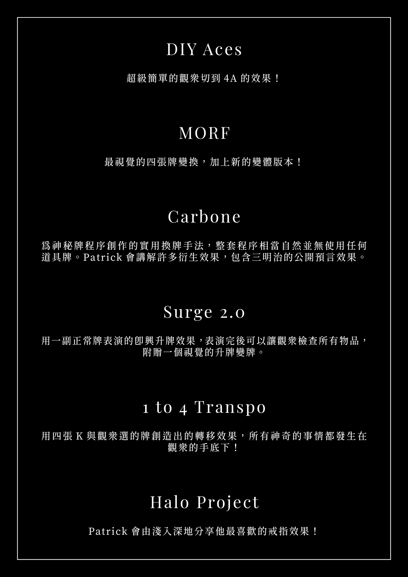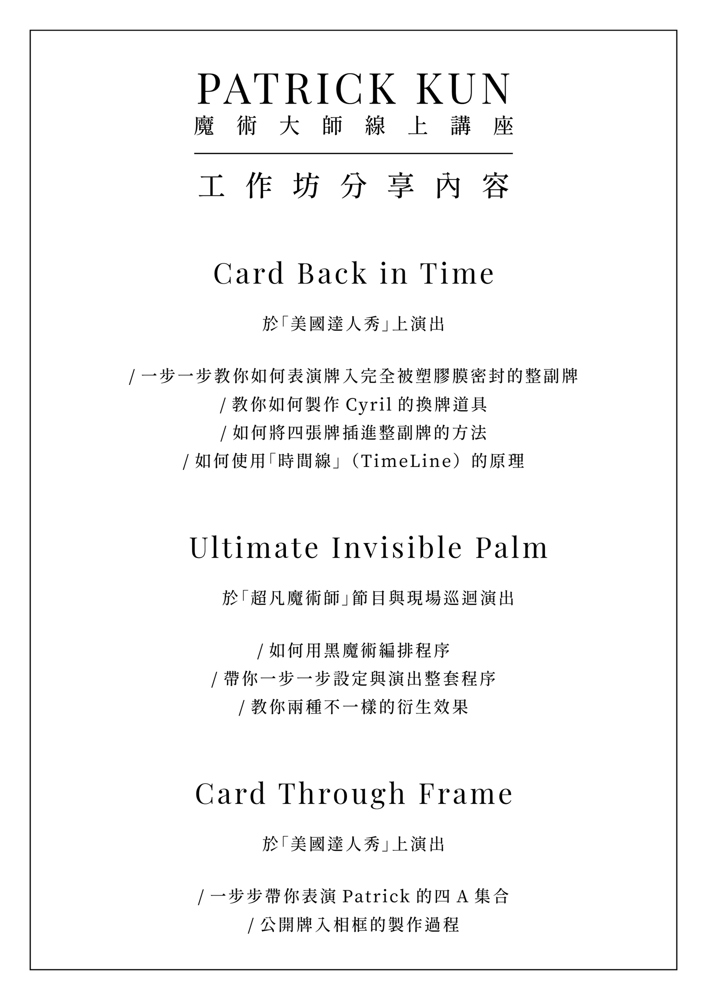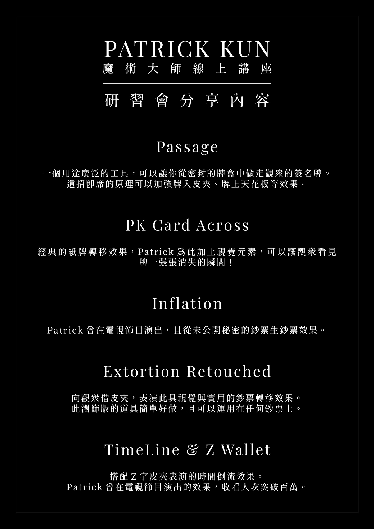 Patrick Kun 以驚人的即興視覺魔術聲名鵲起,發行的創意作品在圈內大受好評,視覺化的效果屢屢帶給魔術圈衝擊,年紀輕輕就擔任過大衛考柏菲、Cyril等知名魔術師的顧問。