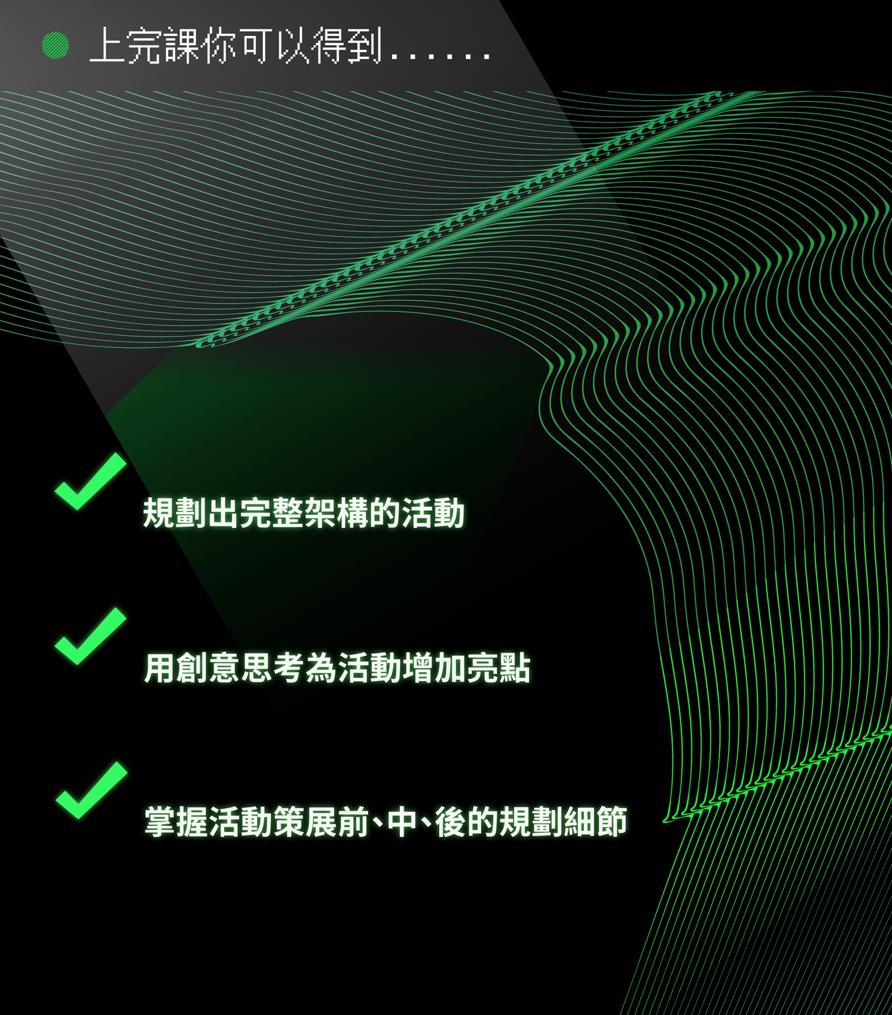 - 本課程滿15人開課。開課與否詳見活動頁面,最遲於開課日前5天公告。 開課通知將於開課日(含)前3日以報名時填寫之E-mail寄送;若未達開班人數將於全額退費。