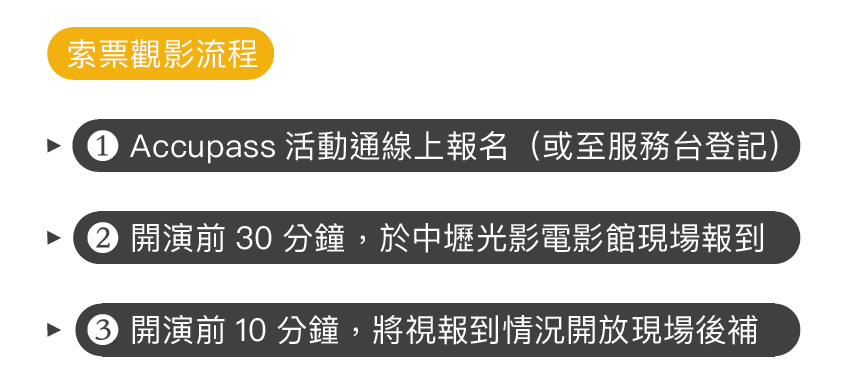 2. 請於開演前30分鐘至現場報到,開演前10分鐘將釋出予現場候補,逾時不候。