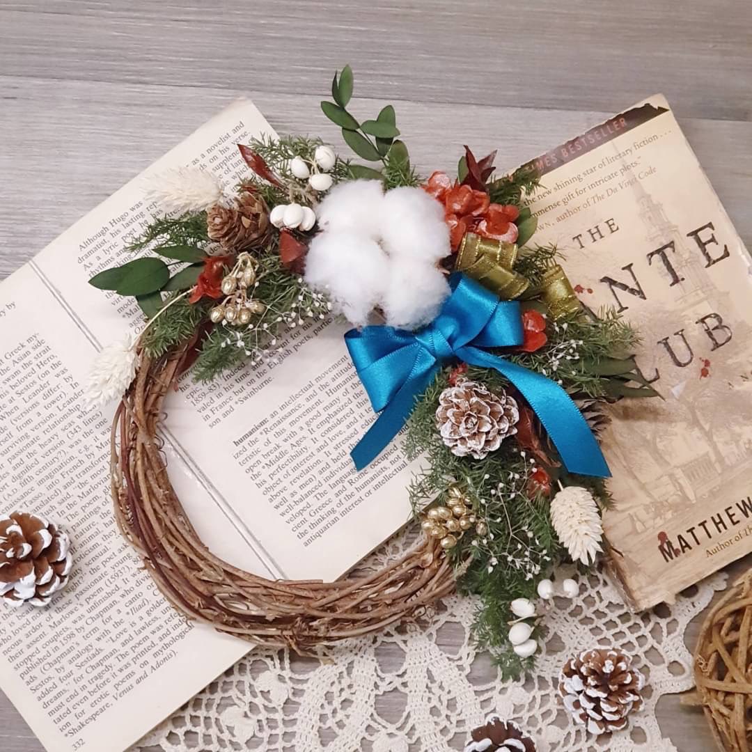 以永生雪松製作成圈,以乾燥花、果實裝點屬於自己的美麗聖誕