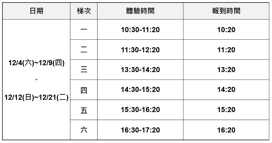 3. 報到截止時間為每一梯次前10分鐘,請體驗人員準時報到,若超過該梯次報到時間,視為放棄體驗資格,名額將開放現場人員報名體驗。現場可體驗人數將於每梯次報到後,於會場入口公布。