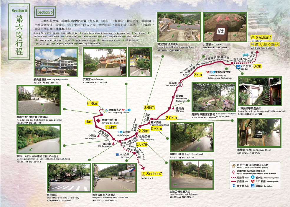 9:15~16:00 中華科技大學→中華技術學院步道→九五峰→拇指山→紫雲街→糶米古道→崇德街→土地公嶺步道→忠正嶺安祿宮→和平東路三段636巷→世界山莊→(富陽支線)→軍功山→中埔山→富陽生態公園→捷運麟光站