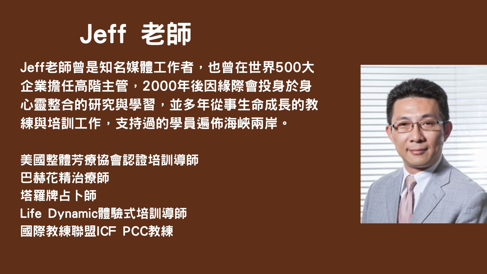 Jeff老師曾是知名媒體工作者,也曾在世界500強企業擔任高階主管,公元2000年後因緣際會投身於身心靈整合的研究與學習,並多年從事生命成長的教練與培訓工作,支持過的學員遍佈海峽兩岸。