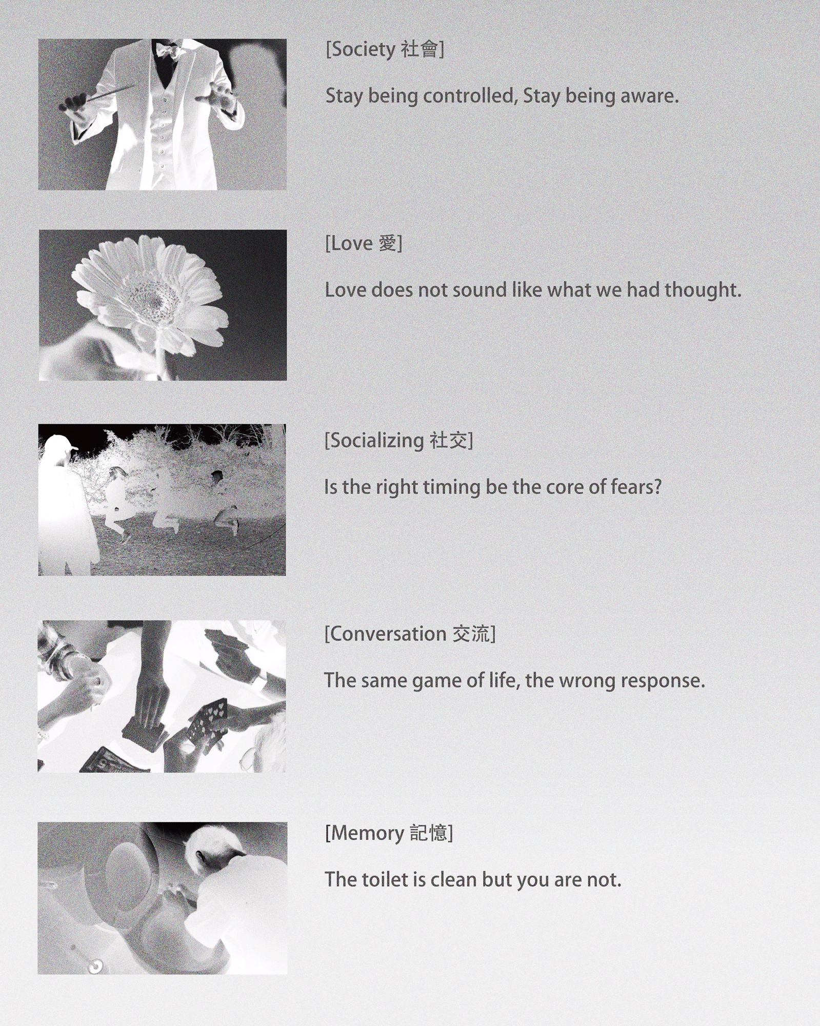 黑白畫面再顛倒成負片畫面是一種「從靈魂世界的次元空間」去回顧當下的感覺。在這樣的負片世界裡,時間的感受比較能重新被定義,每支影片的一分鐘對我而言也是一段人生經驗的長度。聲音的部分,’’UNDERTONE’’透過在每個影像的聲音上定位頻率、響度、方向,代表著腦海中複雜的感受,提供觀者來自當下時空中主角心境的線索