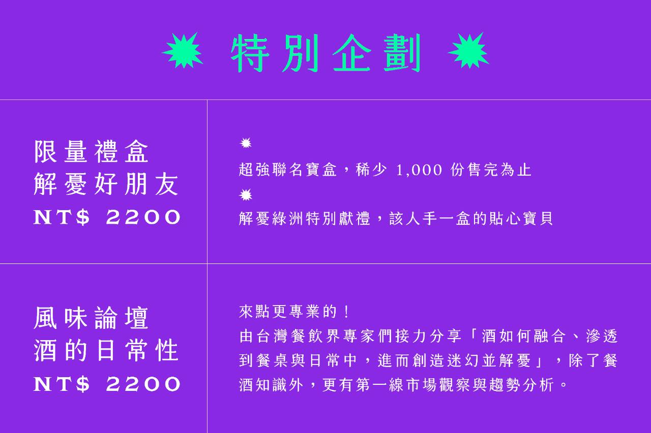 青花驕、小樂沐、百齡罈、啤酒頭釀造、裸餐酒、酉鬼啤酒、RÒU、威石東葡萄酒、噶瑪蘭威士忌、臺虎精釀...... 80 + 知名餐酒品牌、超多限量聯名商品,一起用五感走進不同時空,到「解憂綠洲」拋開煩憂,來場舒壓放鬆的夢幻假期!