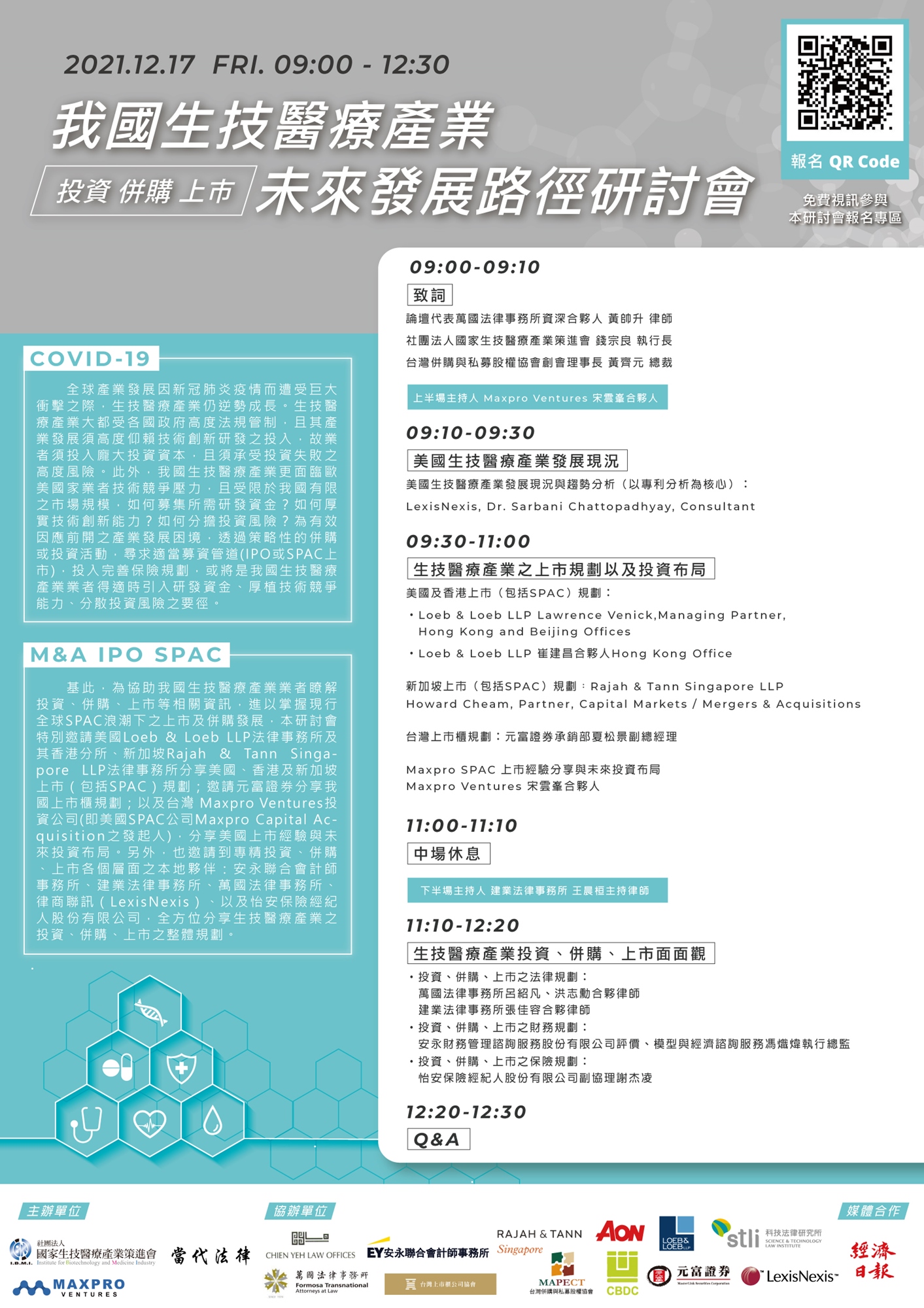 基此,為協助我國生技醫療產業業者瞭解投資、併購、上市等相關資訊,進以掌握現行全球SPAC浪潮下之上市及併購發展,本研討會特別邀請美國Loeb & Loeb LLP法律事務所及其香港分所、新加坡Rajah & Tann Singapore LLP法律事務所分享美國、香港及新加坡上市(包括SPAC)規劃;邀請元富證券分享我國上市櫃規劃;以及台灣 Maxpro Ventures投資公司(即美國SPAC公司Maxpro Capital Acquisition之發起人),分享美國上市經驗與未來投資布局。另外,也邀請到專精投資、併購、上市各個層面之本地夥伴:安永聯合會計師事務所、建業法律事務所、萬國法律事務所、律商聯訊(LexisNexis)、以及怡安保險經紀人股份有限公司,全方位分享生技醫療產業之投資、併購、上市之整體規劃。