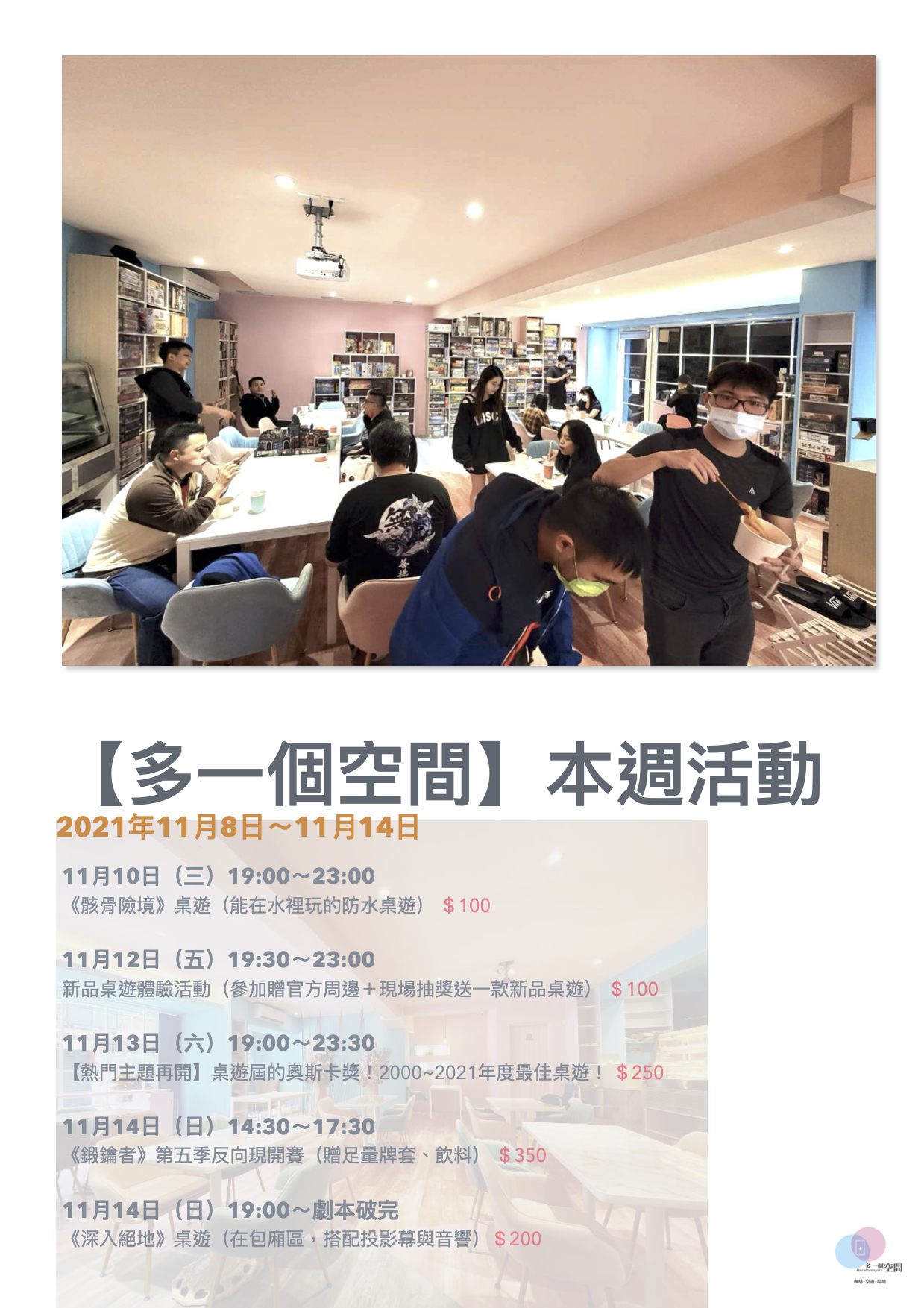 「多一個空間」由【多多看電影】的部落客-多多 所創立,一個致力於舉辦各種娛樂活動的場地,是一家複合式桌遊咖啡店,座落於龍山寺捷運站3號出口,視覺裝潢以馬卡龍粉與湖水藍為主要色調,與附近巷弄的古宅呈現極大的跳躍反差。