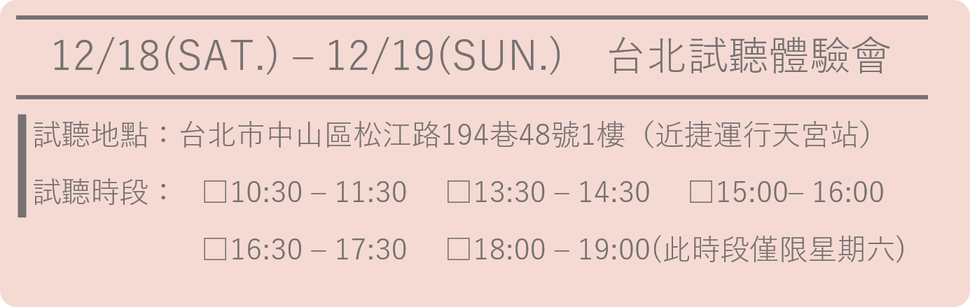 因場地限制以及確保良好試聽體驗,採預約制。