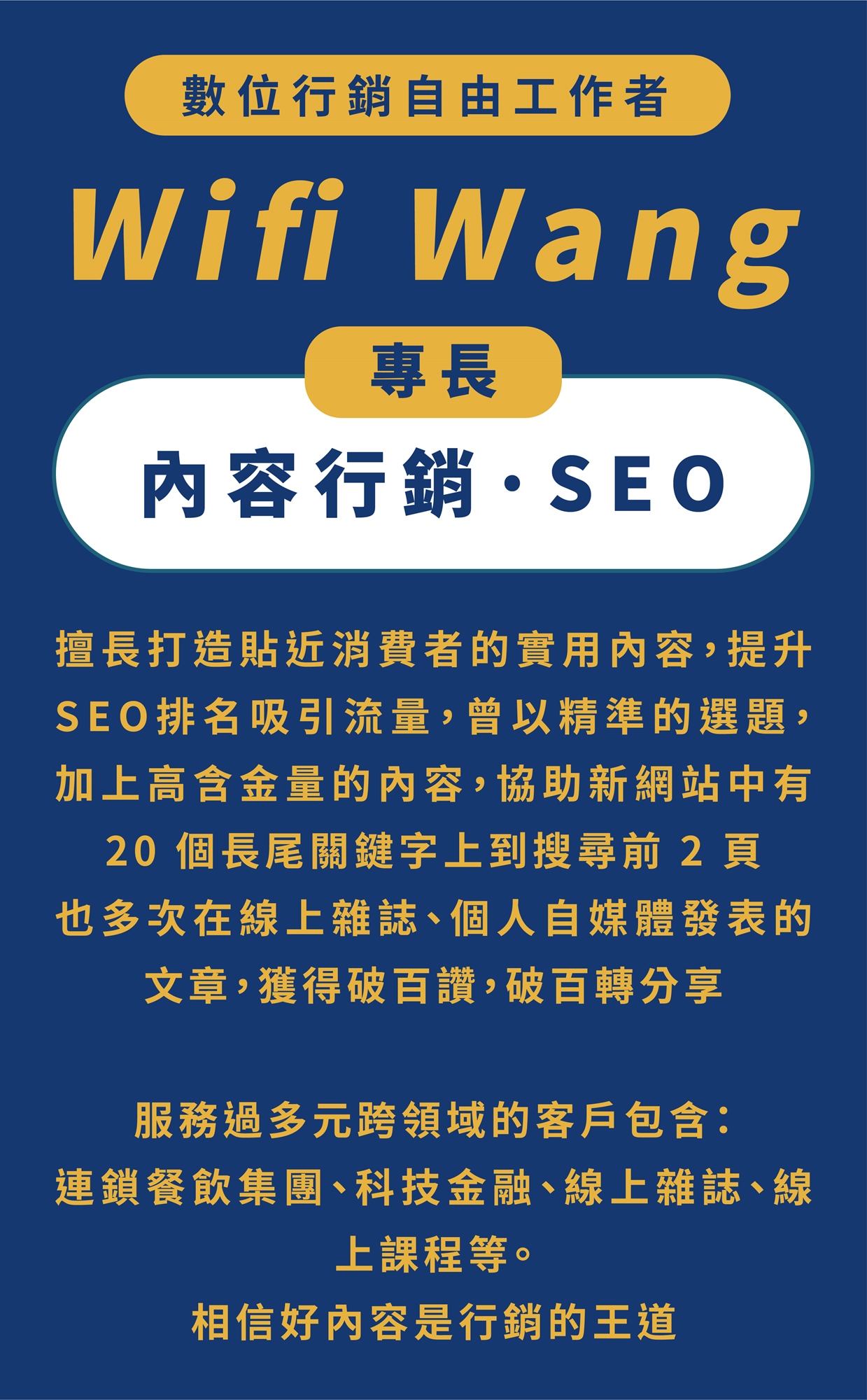 2022放大知識學院首季活動─自媒體講座,邀請三位自媒體工作者,分享生活與工作上獨特內容。第二周我們邀請到了數位行銷工作者Wifi Wang,來跟我們談談內容行銷與SEO,如何打造貼近消費者的實用內容,提升 SEO 排名吸引流量;以精準的選題打造出高含金量內容,協助產業持續放大行銷量能,適合Z世代行銷人與自由工作者一起來交流取經。