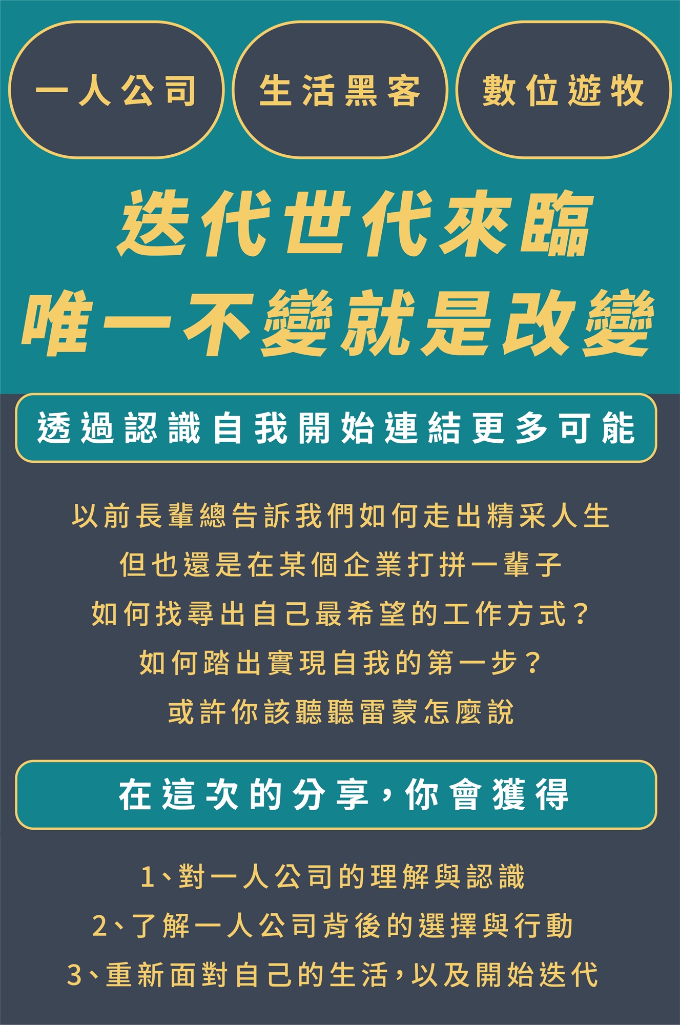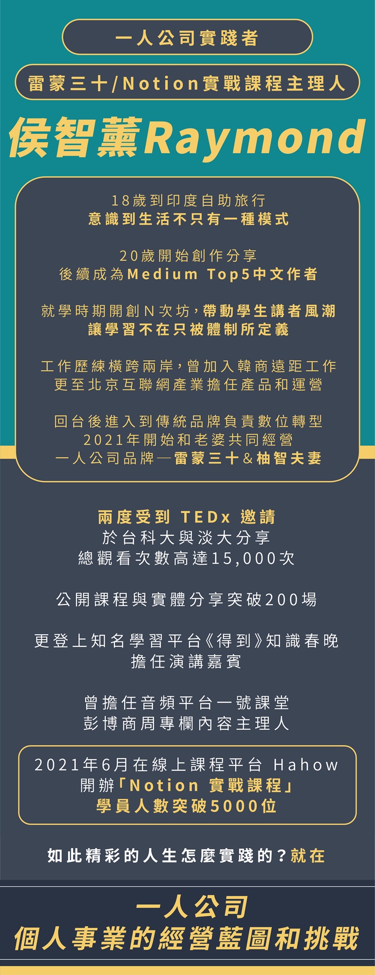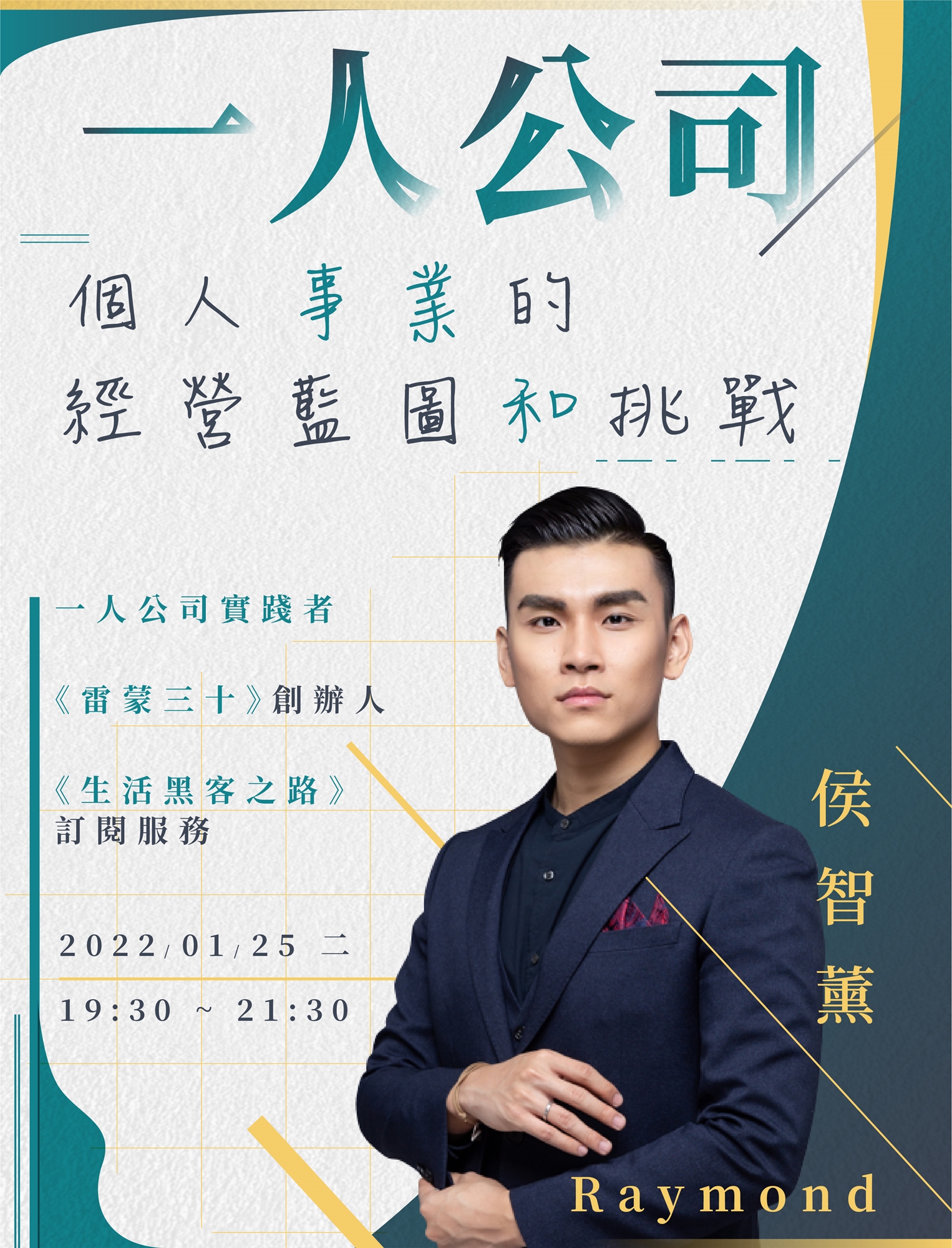 自媒體時代來臨,從部落客到直播主,越來越多「個人」被世界看見!一人公司觀念也隨之興起,無論你是創作者、設計師,又或者是一名教練、顧問,你的專業價值都可以透過更有效地傳遞而被大眾了解,進而產生互利。1月自媒體講座最後一堂,我們邀請到生活黑客實踐者《雷蒙三十》的侯智薰 Raymond 來跟我們談談,他在〈一人公司〉經營路上的思考與迭代!