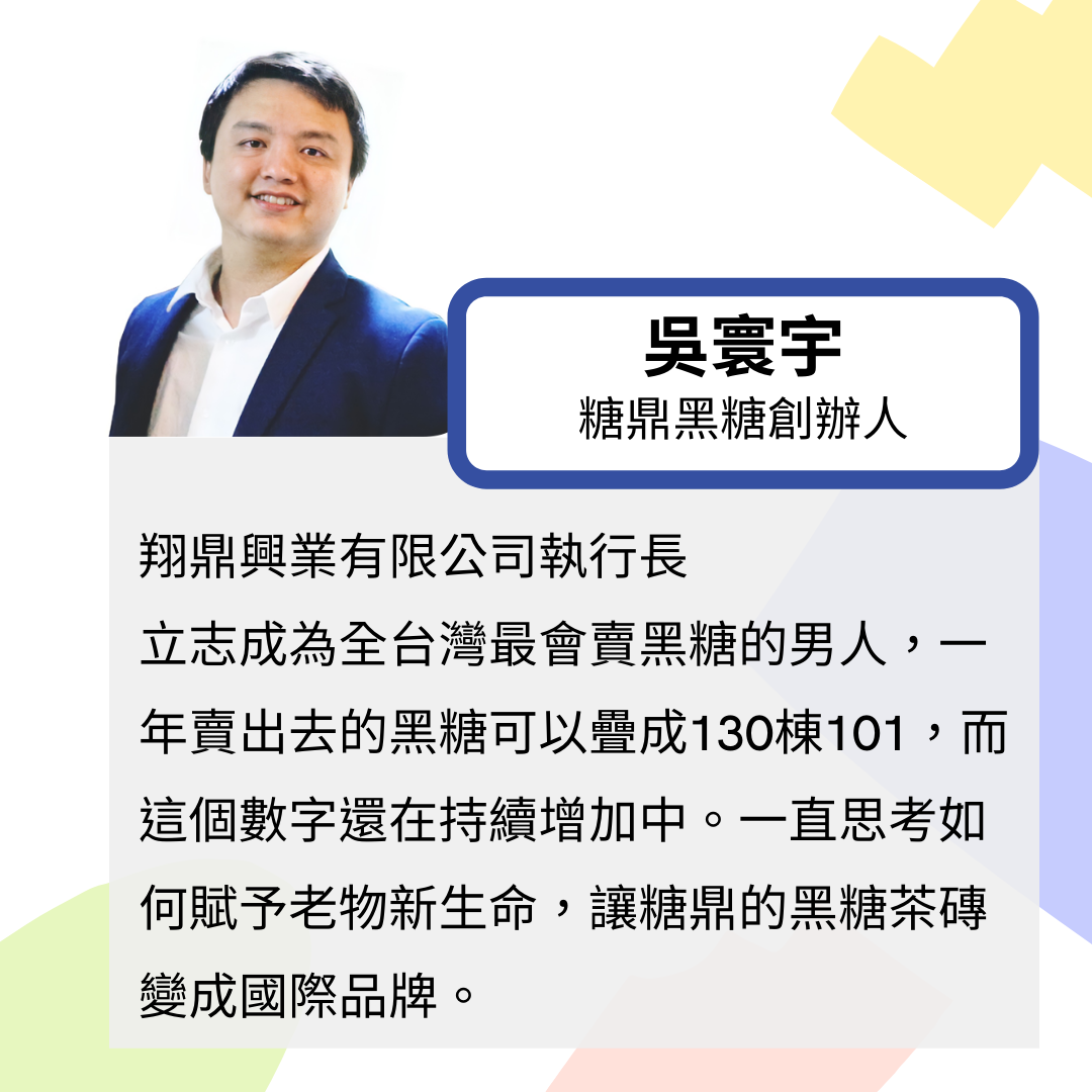 立志成為全台灣最會賣黑糖的男人,一年賣出去的黑糖可以疊成130棟101,而這個數字還在持續增加中。一直思考如何賦予老物新生命,讓糖鼎的黑糖茶磚變成國際品牌。