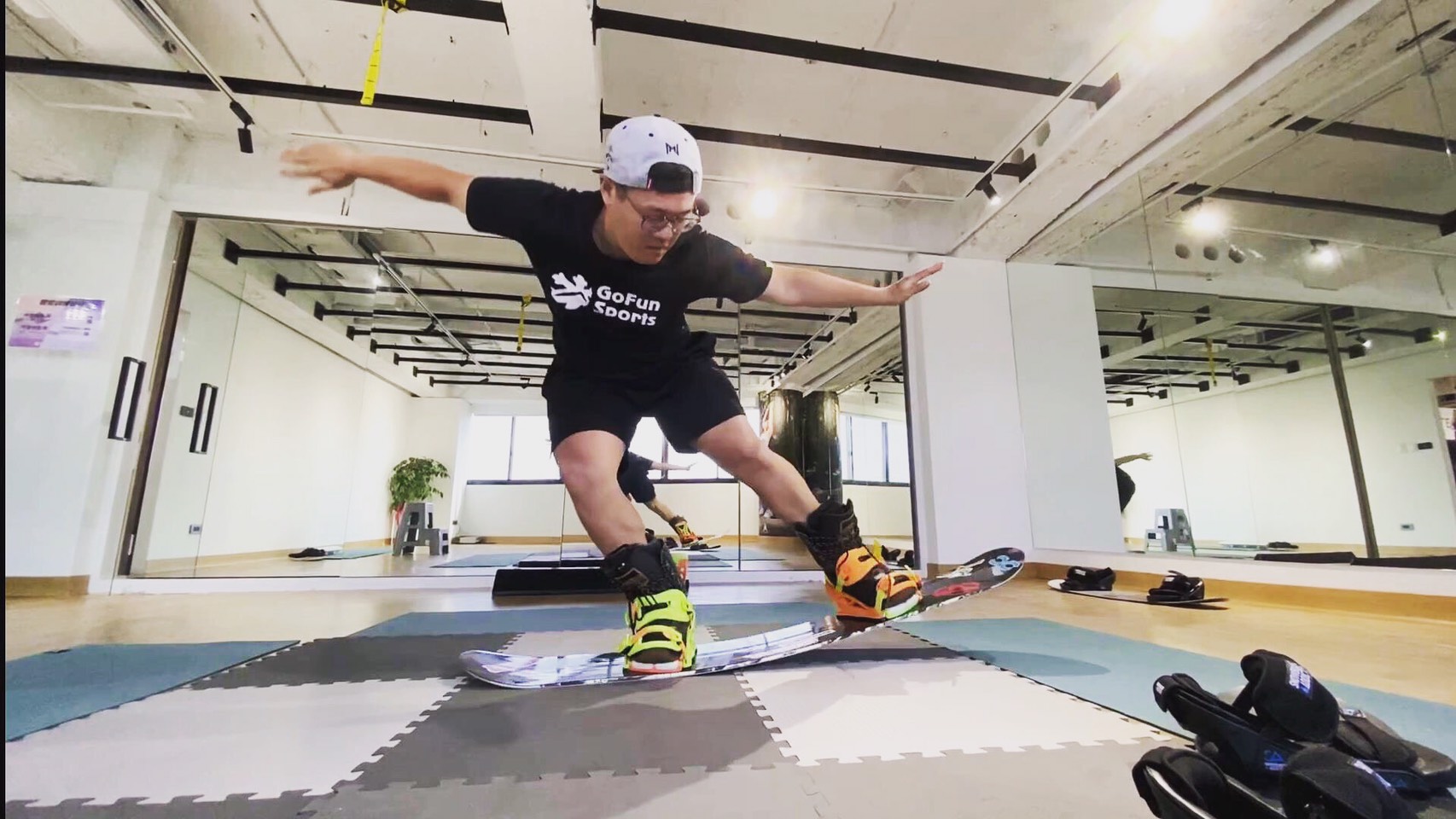 ▼《實戰訓練─SB平地花式課程》建立Snowboard的滑雪觀念,如滑行 Riding 的基本站姿與重心位置,彈跳方法與技術等,更能使肌肉產生記憶,讓身體可以熟悉跳躍、壓板子等動作。