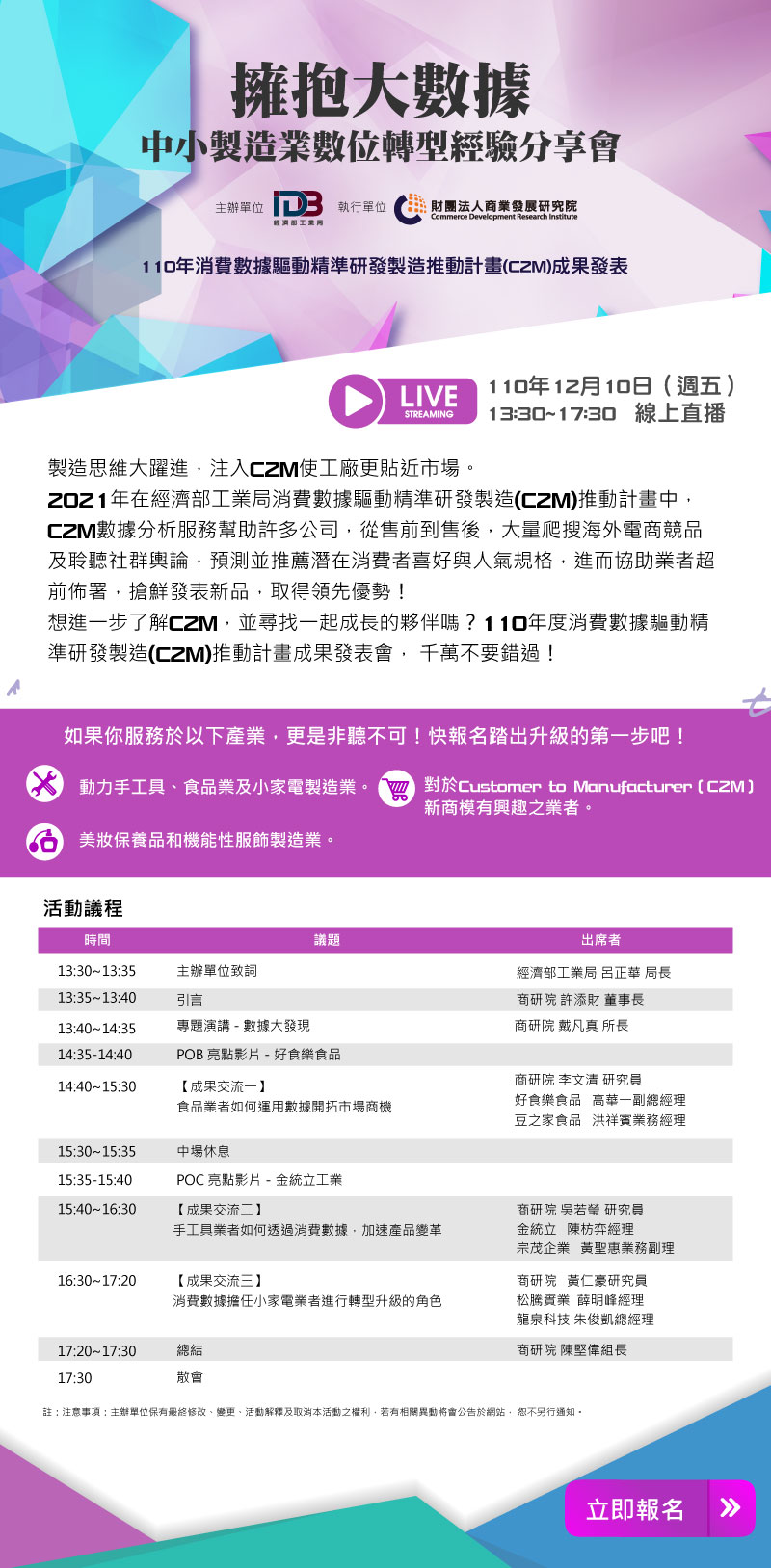 財團法人商業發展研究院(以下簡稱本院)受 【經濟部工業局】 委託辦理【擁抱大數據-中小製造業數位轉型經驗分享會】,向您蒐集個人資料,依個人資料保護法令及本院個人資料保護相關規章,於蒐集您的個人資料前,告知下列事項: