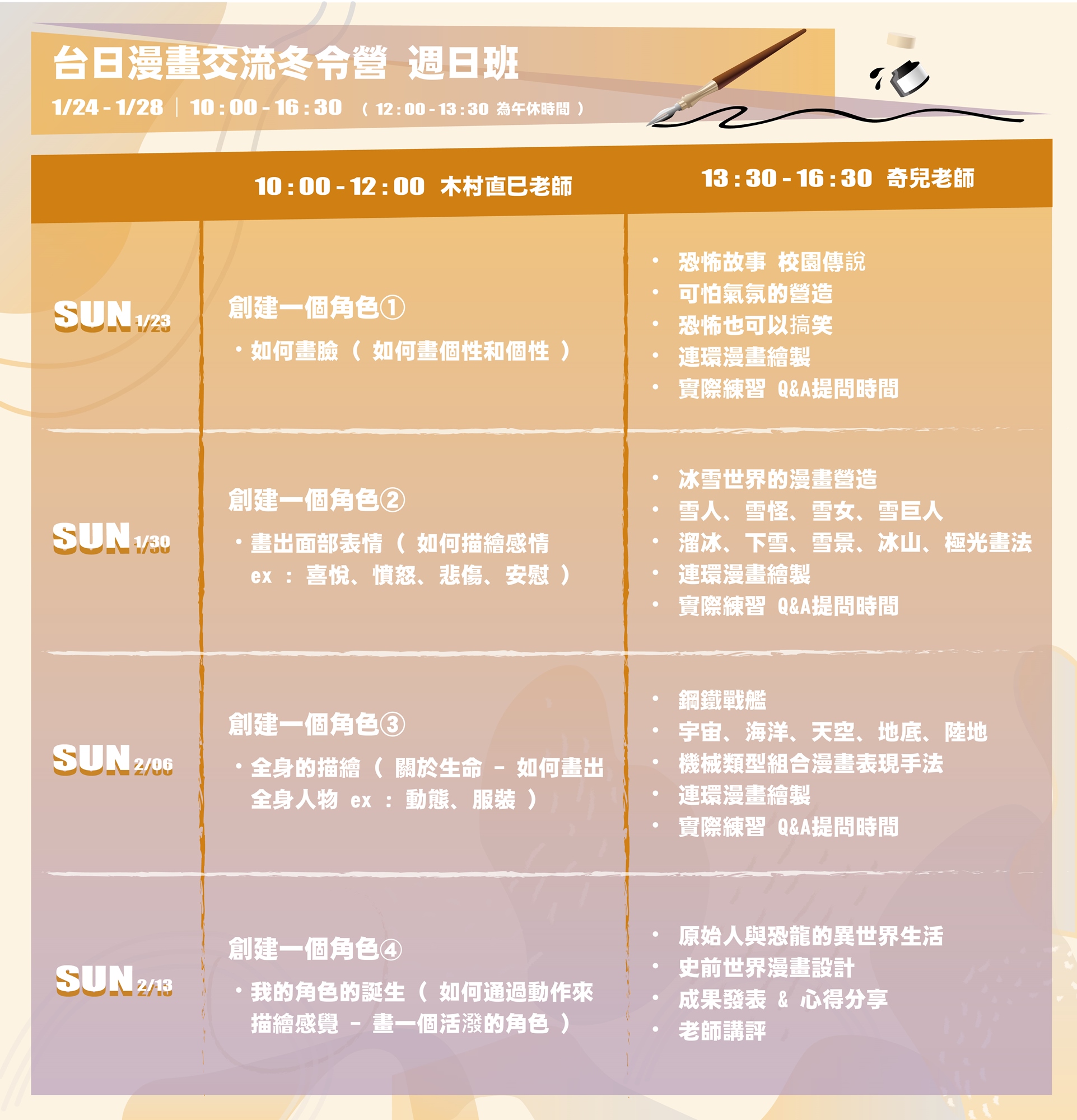 上午10 : 00 - 12: 00 木村直巳老師 下午 13:30 – 16:30 奇兒老師