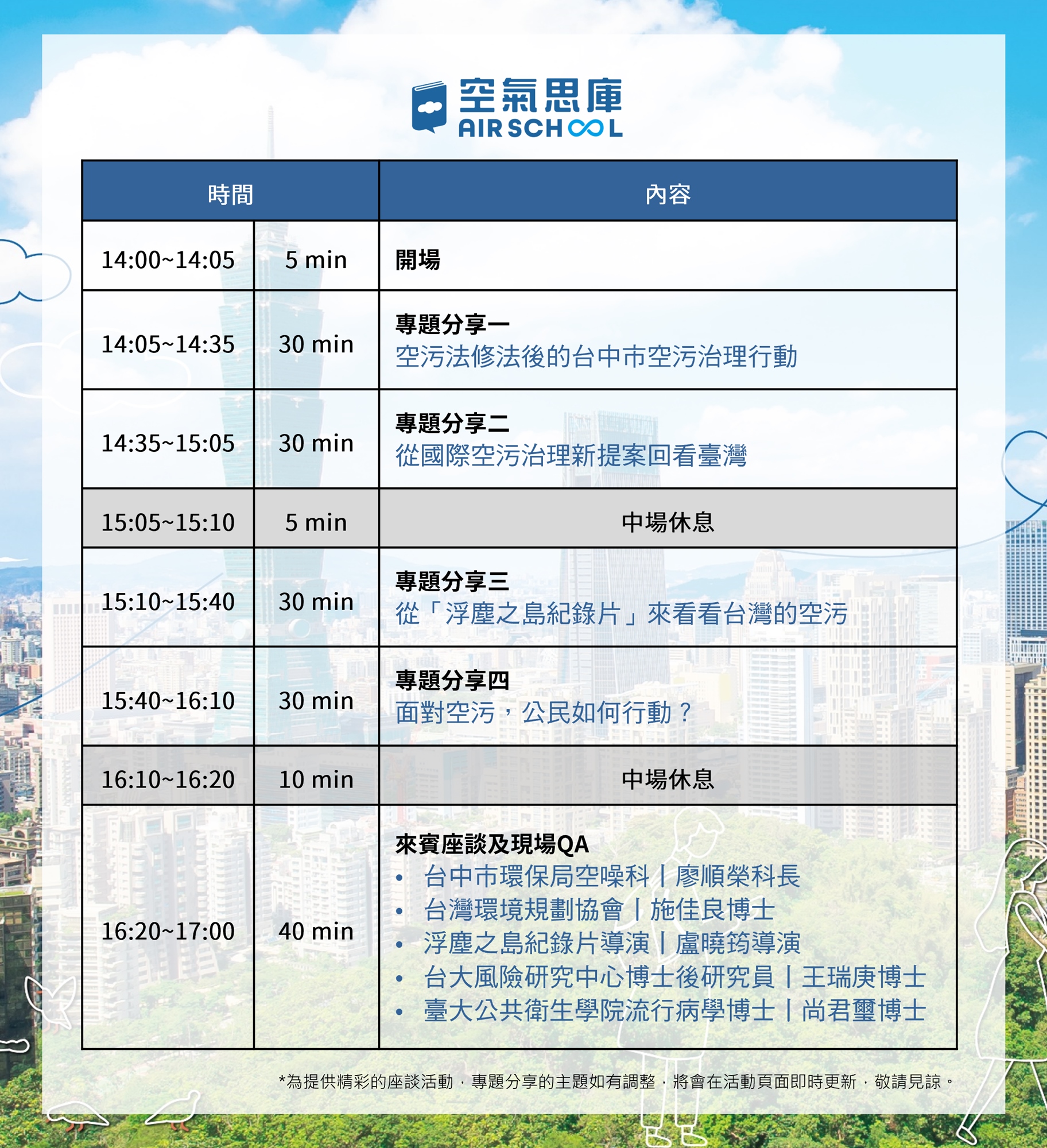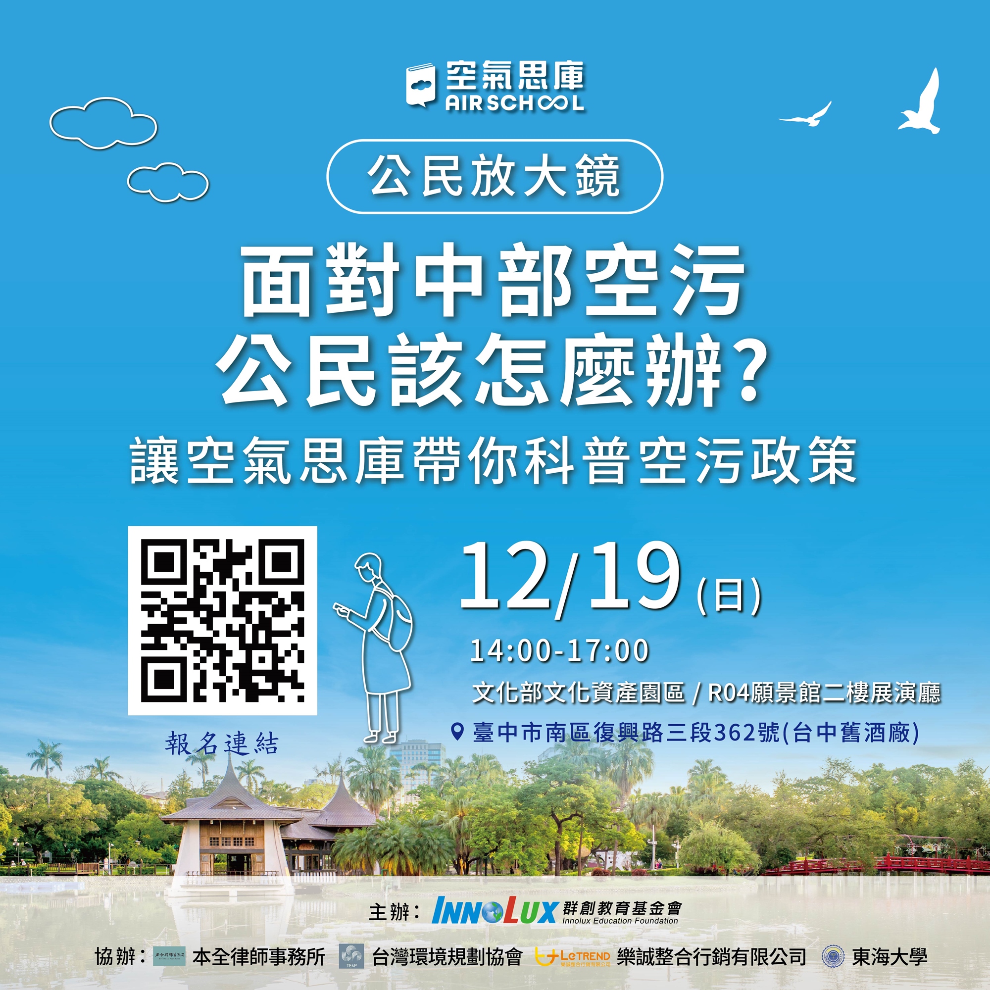 本場座談會將邀請產官學界專家用淺顯易懂的方式,讓法條不再只是文謅謅的天方夜譚,帶領民眾從各個面向深入了解中部目前的空污問題。