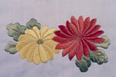 - 緞面繡:是常見的古針法之一,其特色是針腳齊平,繡紋有如緞面質地般光潔勻整。常用於創作花、葉之圖案。