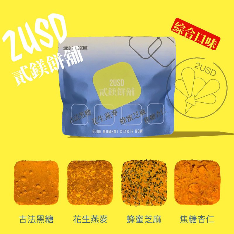 ⭐左)2USD貳鎂餅舖/三合一特惠組→貳鎂餅乾分享包(綜合)x1/杏仁巧克力x1/貳鎂台灣茶(綜合)x1