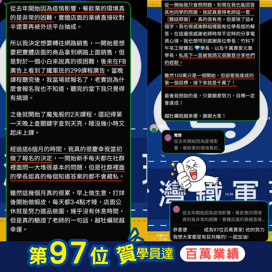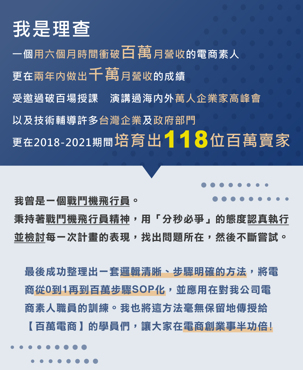 因應疫情關係,百萬電商鐵軍班特例以線上方式進行,為維護良善學習空間,本培訓課程的參與學員及承辦單位,為維護百萬電商鐵軍班的講師顧問之智慧財產權,參訓方將依據本協議內容於課程前中後均對課程內容負保密責任,不得侵害他人營業秘密、智慧財產權及其他權利。