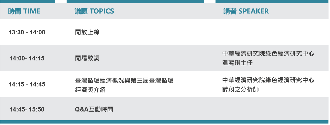 主辦單位中華經濟研究院綠色經濟研究中心(CGE)將於12/23(四)舉辦《臺灣循環經濟獎》第二場線上說明會,全程免費參加,名額有限,歡迎企業踴躍報名。