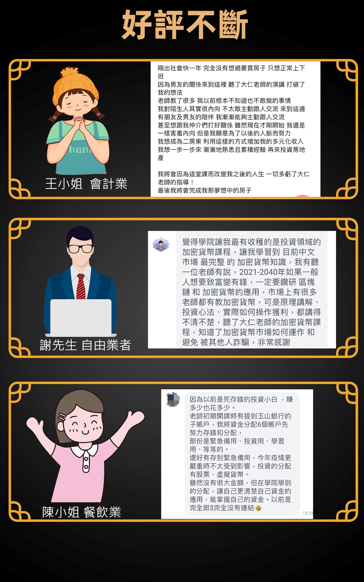目前致力於理財教育、創業教育、商業教育,協助上百位人脫離貧窮的並創造百萬收入。