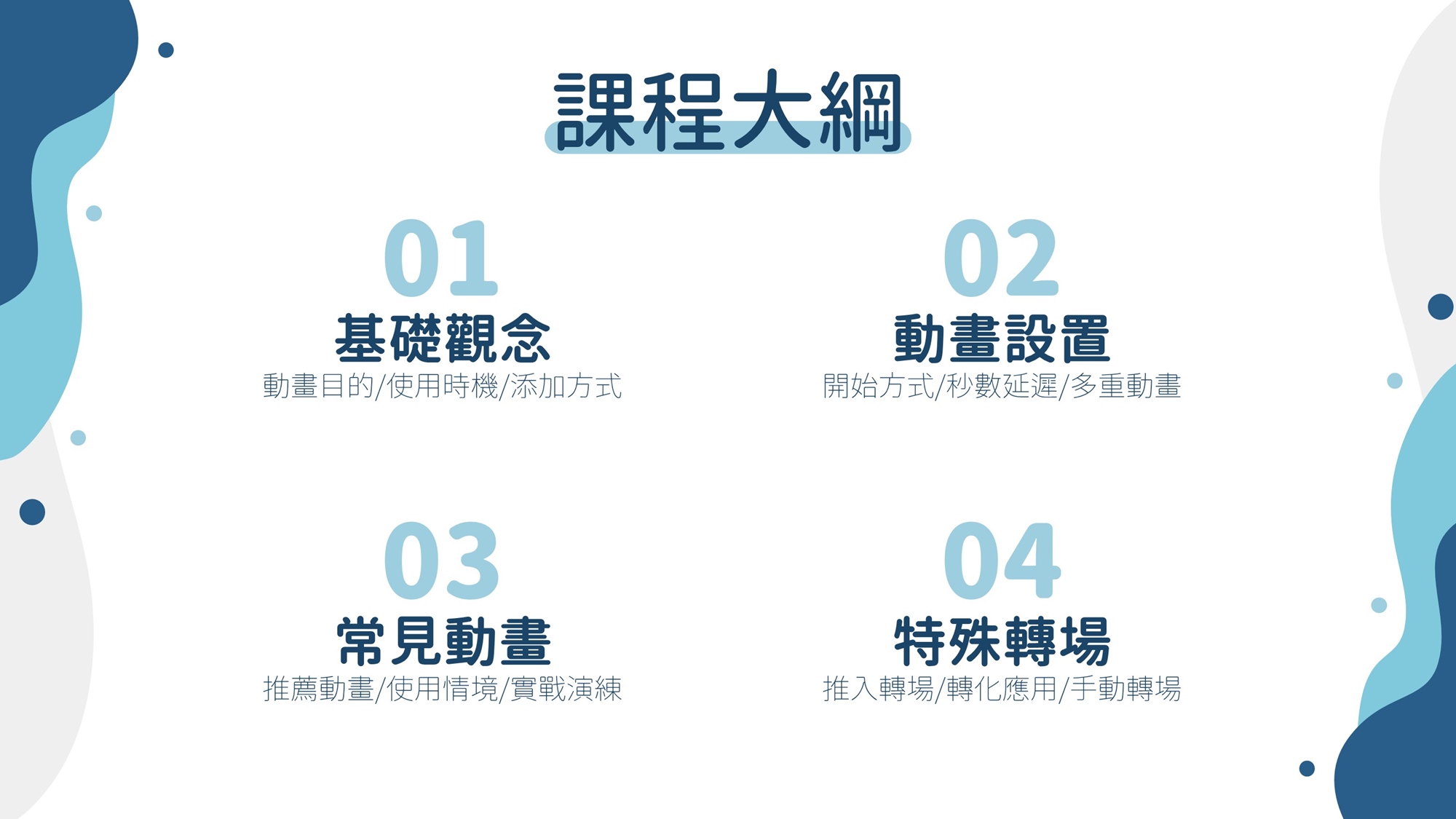 在這堂課中,我們將教你PPT動畫的核心觀念、如何設置和調節動畫、並且教你至少十種以上的好用動畫特效,讓你可以直接應用在簡報之中!