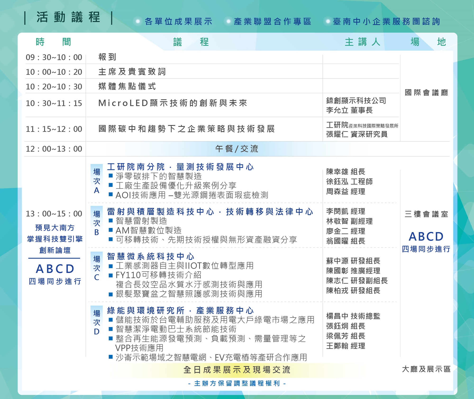 為進一步帶動產業交流,本院特訂本(2021)年12月15日(三)於本院臺南市六甲院區舉辦「預見大南方 掌握科技雙引擎」創新論壇,活動邀請錼創顯示科技公司李允立董事長蒞臨,分享帶領企業投入智慧化的獨門心法,本院也將展示近年厚植於南部的產業化成果,以創新科技翻轉南臺灣經濟。