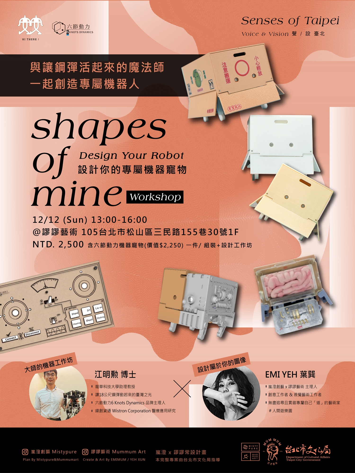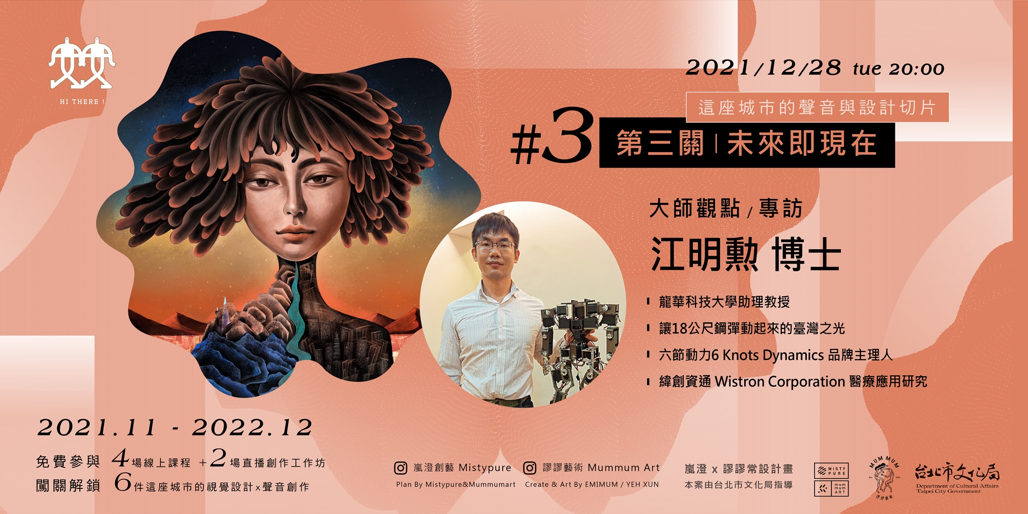 讓18公尺鋼彈活起來的機器人大師江明勲(チェン・ミンスン),將親自帶各位完成屬於你的專屬機器寵物!除了認識到當今機器人、人工智能的發展,透過親手操作,讓大家可以輕鬆入門機器人的魅力。除了最為著名在日本鋼彈 Gundam Global Challenge中讓鋼彈動了起來,江老師專長為仿生機器人、載具動力學、強健控制、運動醫學,長年深耕人形機器人設計與其移動技術研究,並發展人形機器人移動技術,致力開發從外觀到行為都接近人類的機器人。