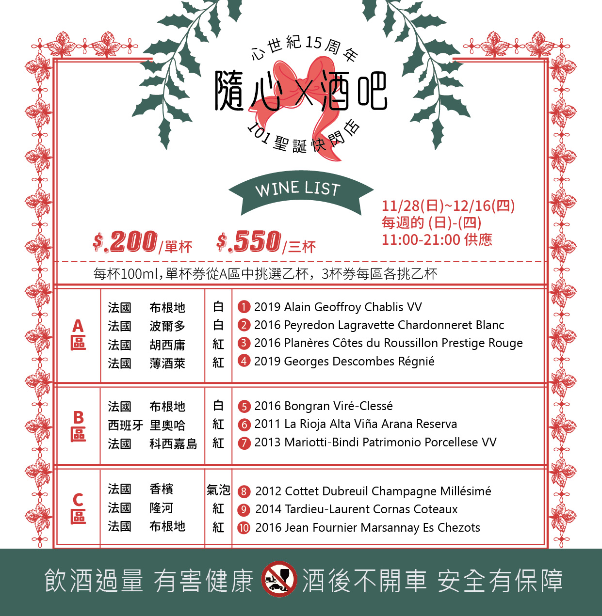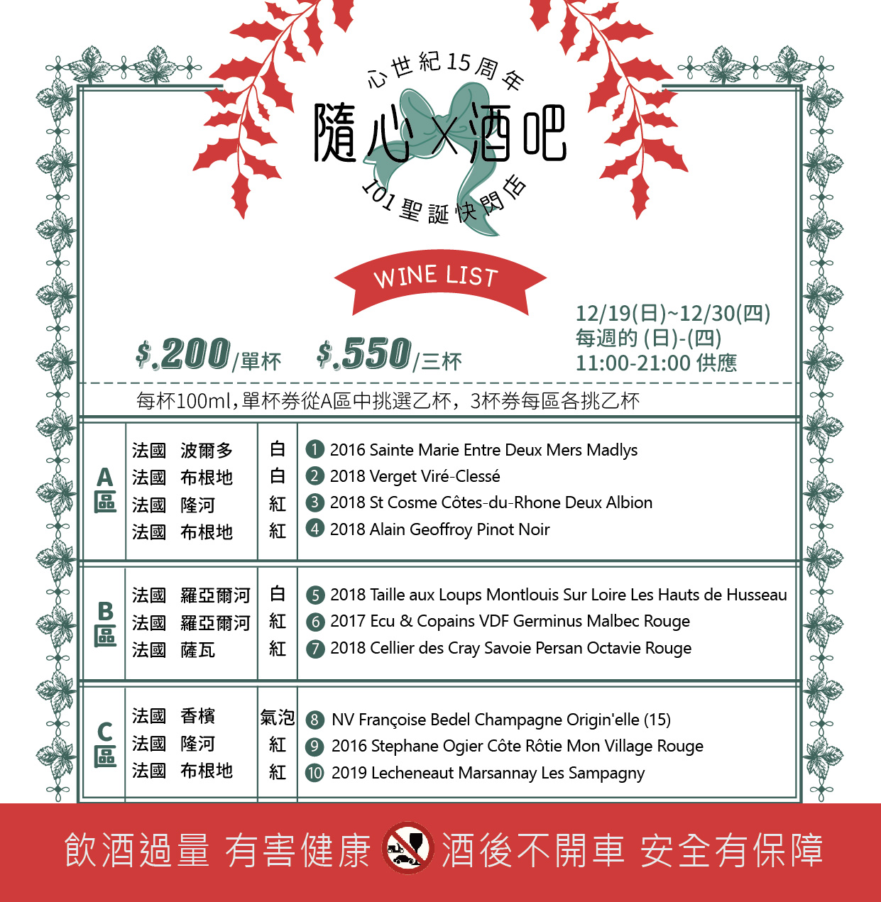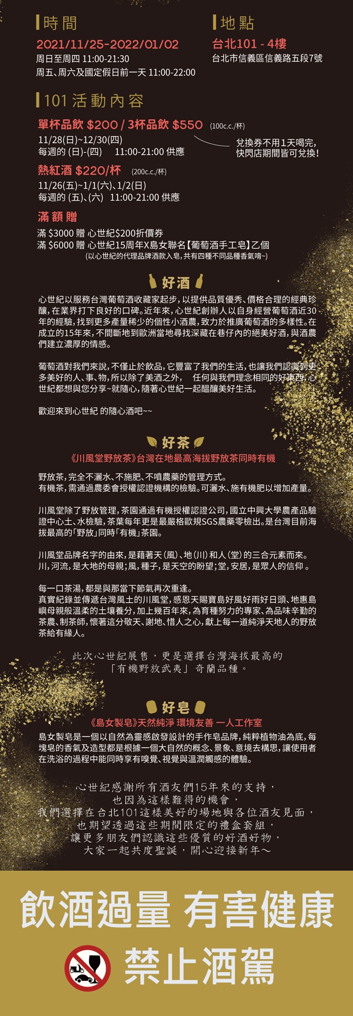 這次快閃店內即將展示約一百種酒款,也是心世紀在葡萄酒耕耘的多年經驗的濃縮精華,著名雙B產區布根地、波爾多,節慶派對少不了的香檳區,還有近年來越來越受關注的阿爾薩斯、侏羅產區等,讓您零時差,用美酒環法一圈。