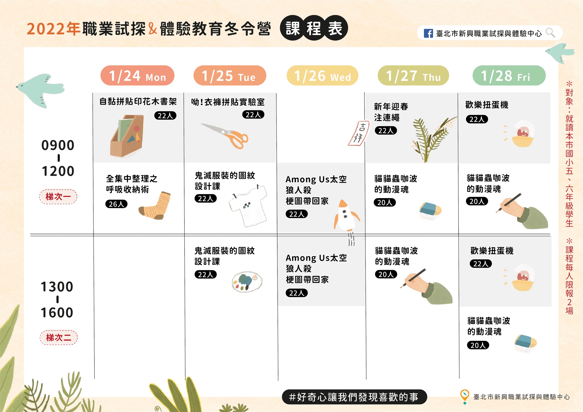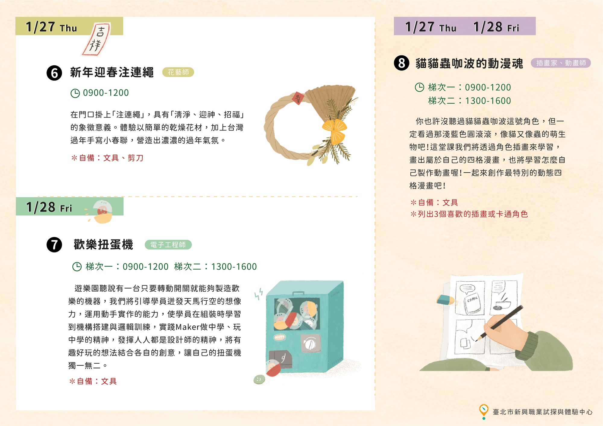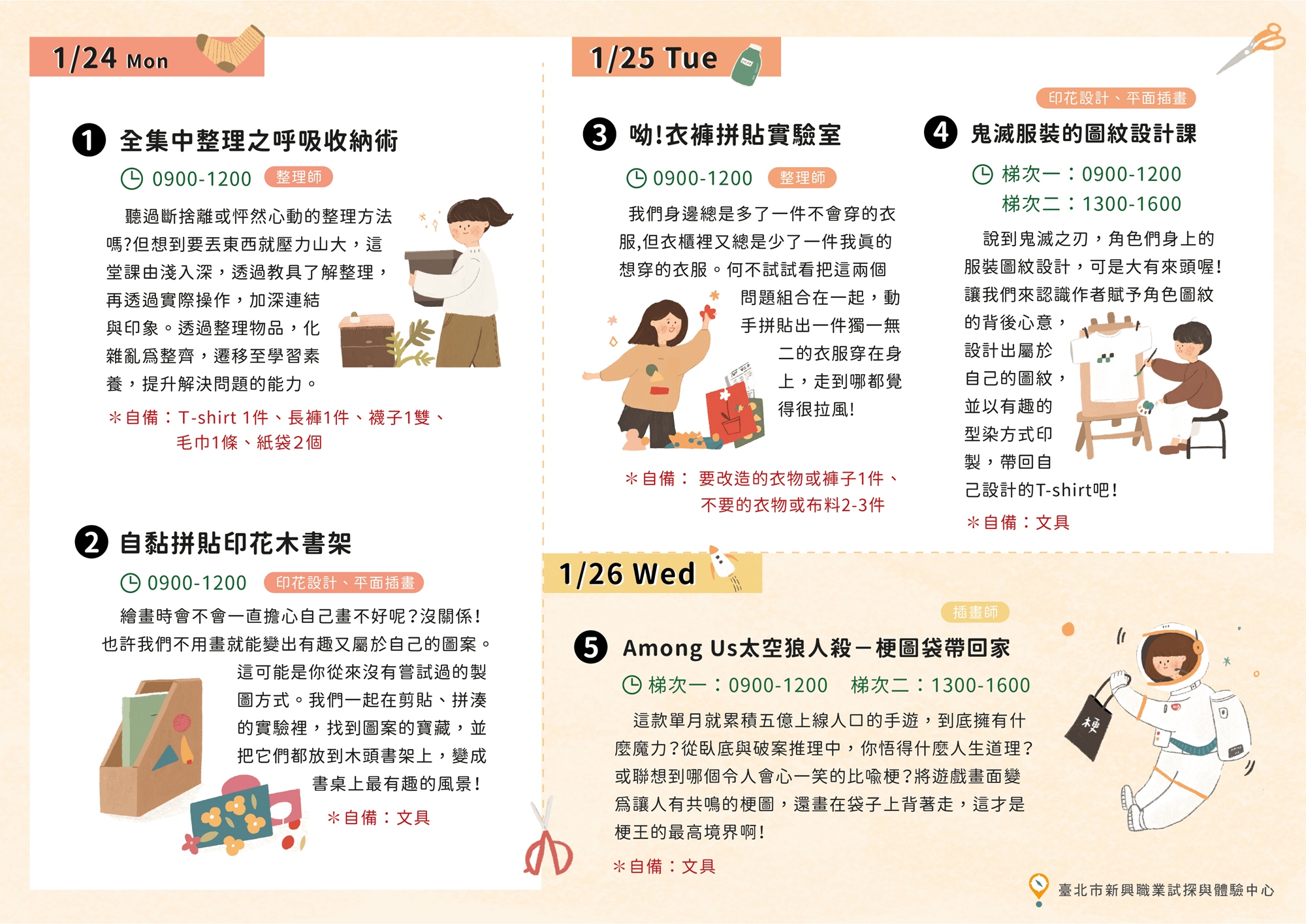 中心將於近期公告1/24~1/28全新職業試探線上主題課程,提供本市國中小學生免費報名參加,線上課程詳情請留意職探中心粉專最新公告,敬請稍待。