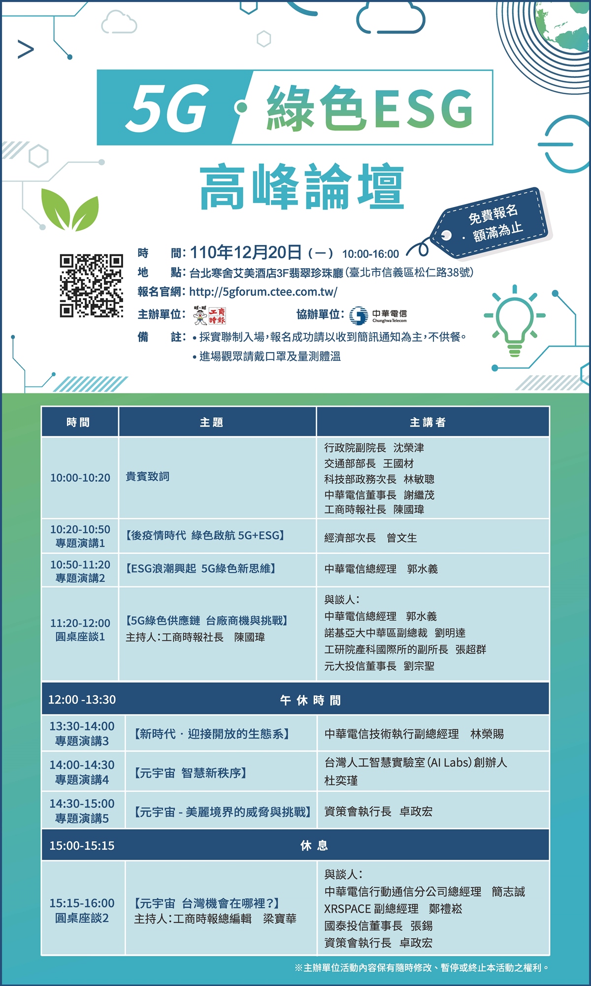 全球化正在帶動產業進行數位轉型,ESG浪潮隨之興起,國際知名企業已競相透過數位科技結合ESG管理原則,積極打造「永續新經濟」,中華電信身為國內電信龍頭,過去十多年來積極推動綠色供應鏈,將為國內企業表帥,而未來5G網路建設對綠色採購的要求,相信更是國內ICT業者所殷切期盼了解的。 這次論壇希望透過產官代表,能讓各界了解中華電信過去在ESG所做的努力,以及未來在5G綠色採購、以及與國產設備商的合作方向。 工商時報與中華電信攜手主辦「5G˙綠色ESG」高峰論壇,會中特別邀請專家、業界代表進行專題演講及高峰對談,一同見證5G X ESG創新未來。