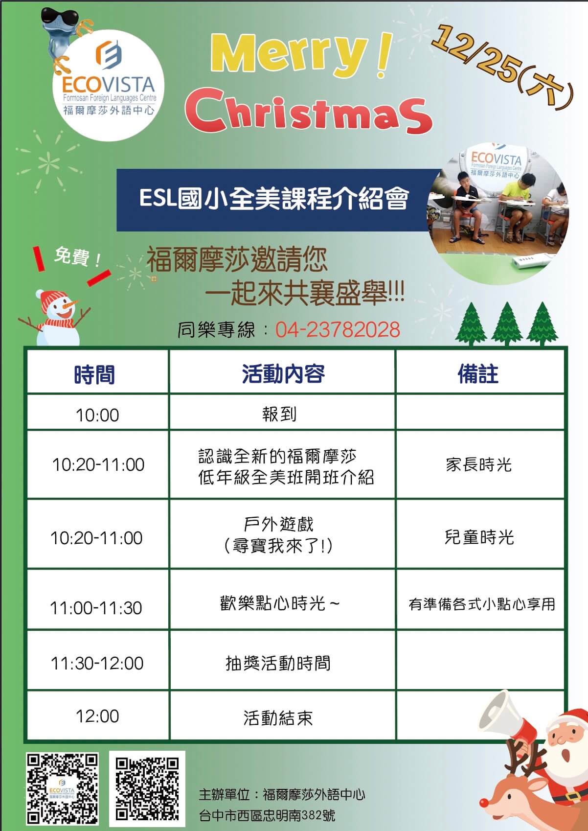 12/25 聖誕節ESL全美語課程體驗活動|福爾摩莎外語中心