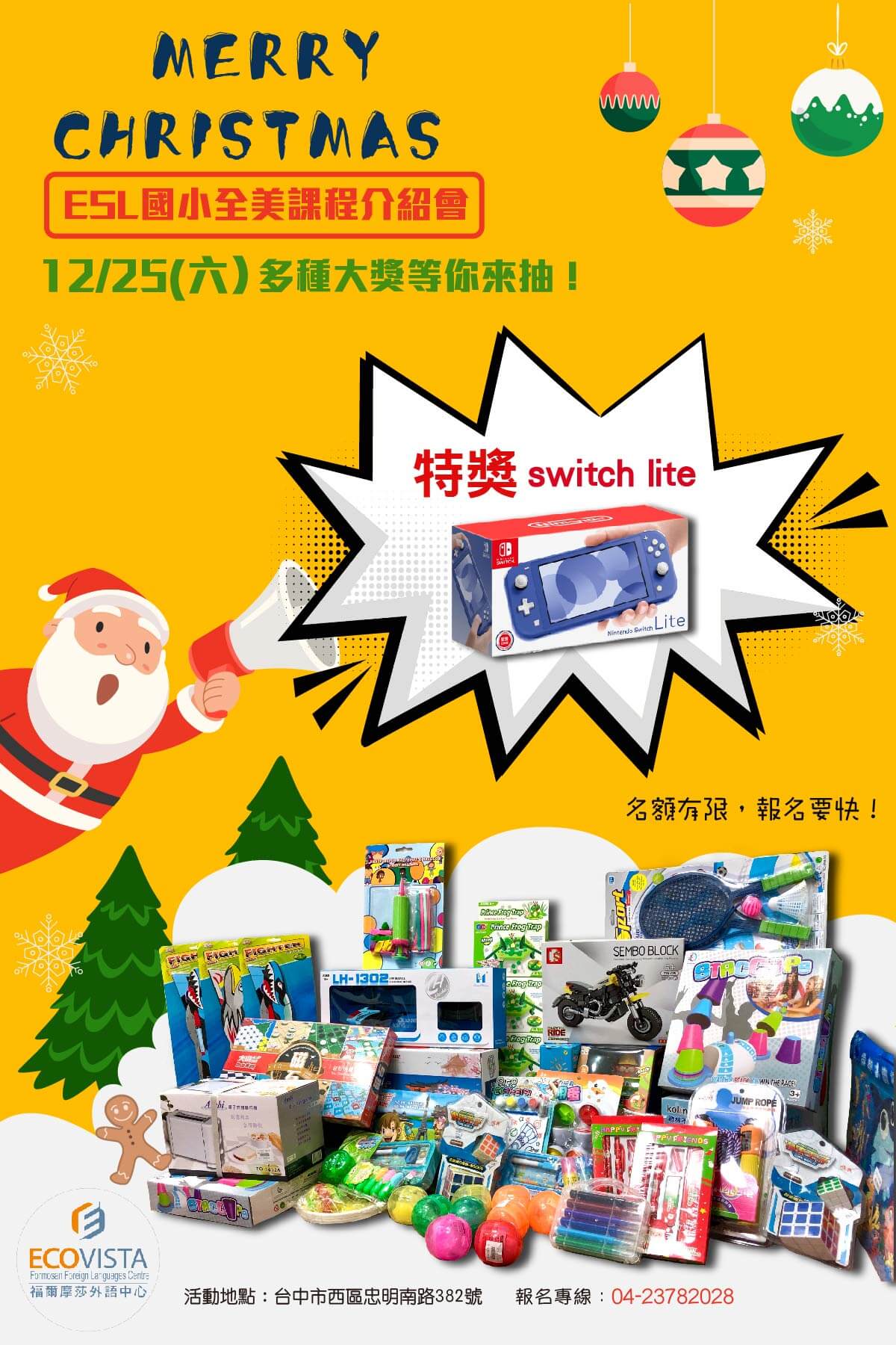 今年耶誕,福爾摩莎外語中心特地與外師團隊聯合舉辦聖誕節全美語體驗活動,現場還有歡樂點心時光、有趣又好玩的戶外尋寶遊戲,和壓軸的抽獎活動,最大獎是任天堂Switch Lite!還有各項好禮送給你,有來就有機會唷!