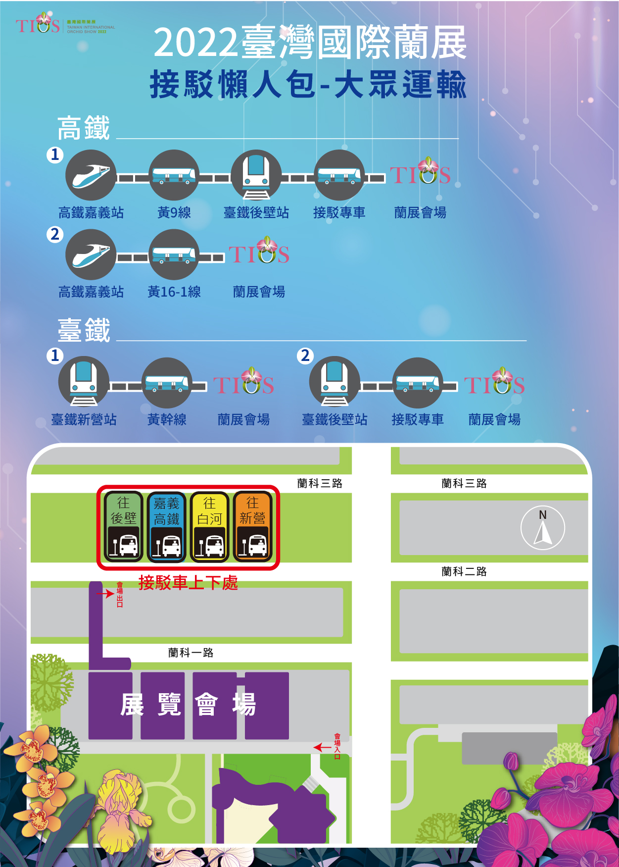 高鐵|高鐵嘉義站→轉乘大台南公車(黃9線)→臺鐵後壁站下車→轉乘蘭展接駁專車→2022蘭展會場