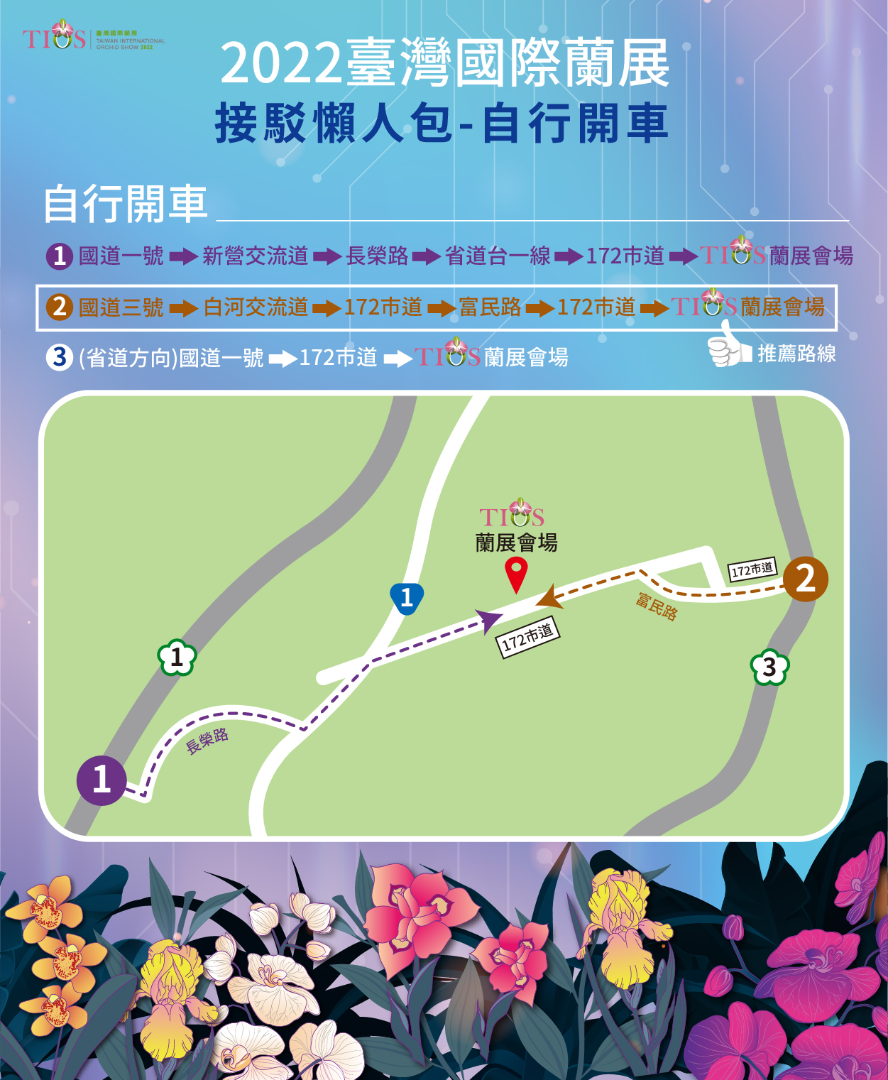- 國道三號→白河交流道→172市道→富民路→172市道→2022蘭展會場