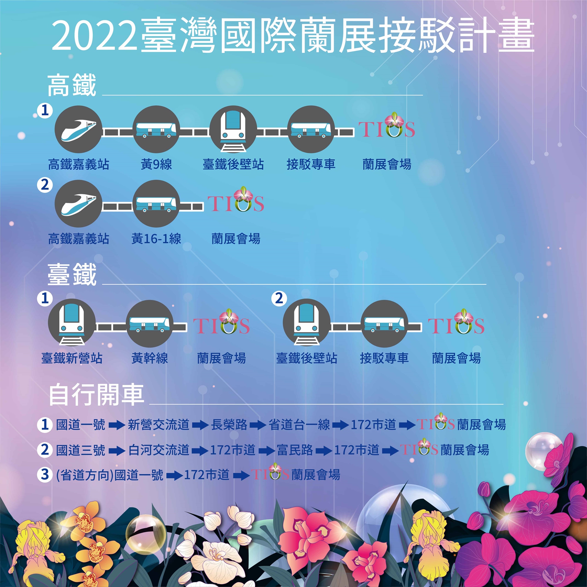- 國道一號→新營交流道→長榮路→省道台一線→172市道→2022蘭展會場
