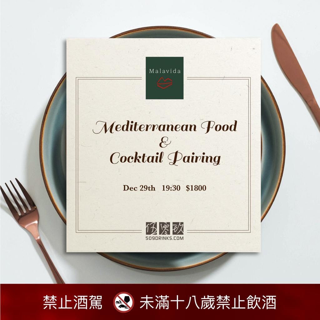活動時間將會在12/29晚上7:30舉行。每位貴賓只需$1800,即可享用到五杯不同的調酒與五道美味的地中海料理。