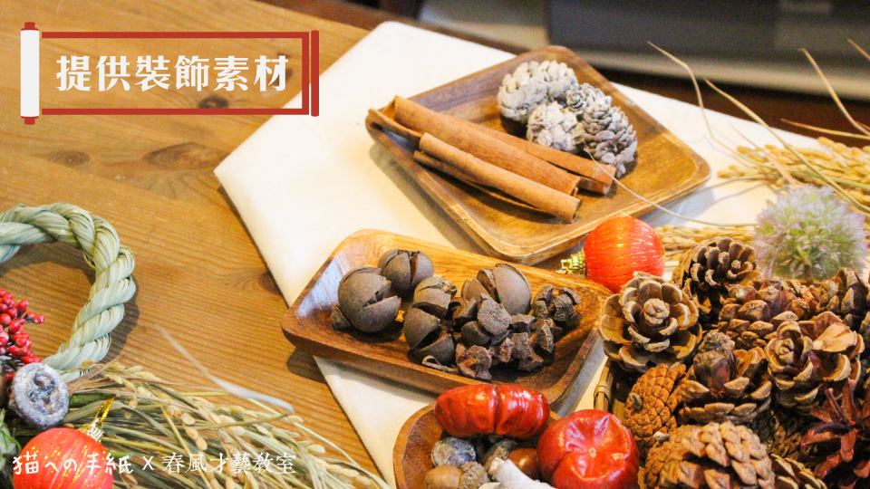 ・各式裝飾小物(塑膠花草、毬果、松果、樹枝、肉桂等)