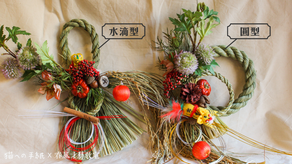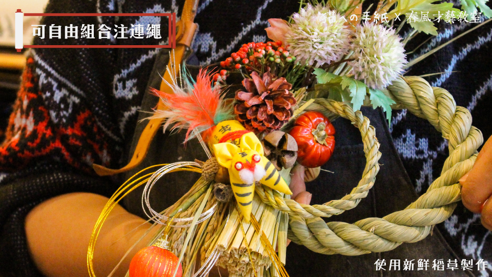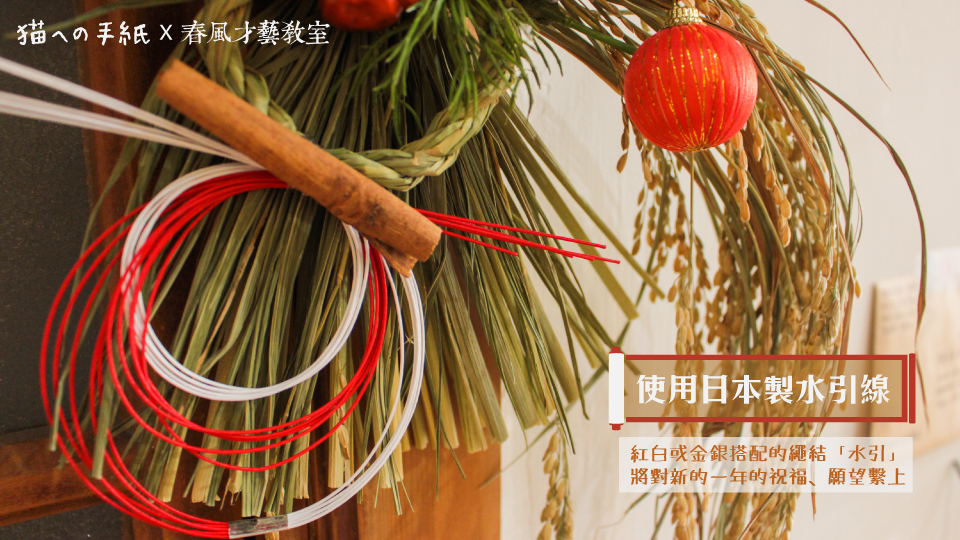 對於日本傳統文化有深入研究的 甜甜老師,特別選用新鮮稻草製成的注連繩,以及日本製水引線編織成的水引繩結,為新的一年繫上祈福心意。