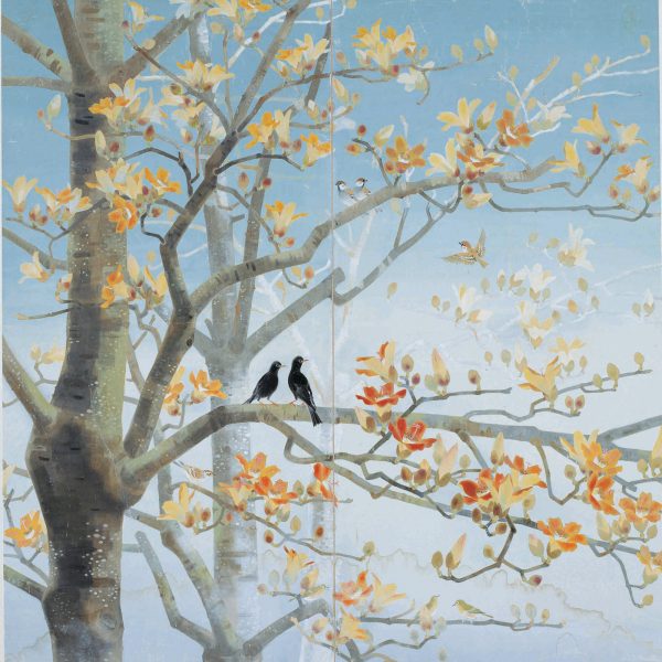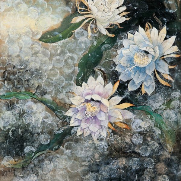 花鳥是膠彩畫家所熱愛的題材,描寫花卉有黃鷗波的〈暗香浮動〉,傳達曇花在夜晚綻放的美妙;郭雪湖的〈石榴斑鳩〉,將水墨與東洋畫的技法巧妙的結合。