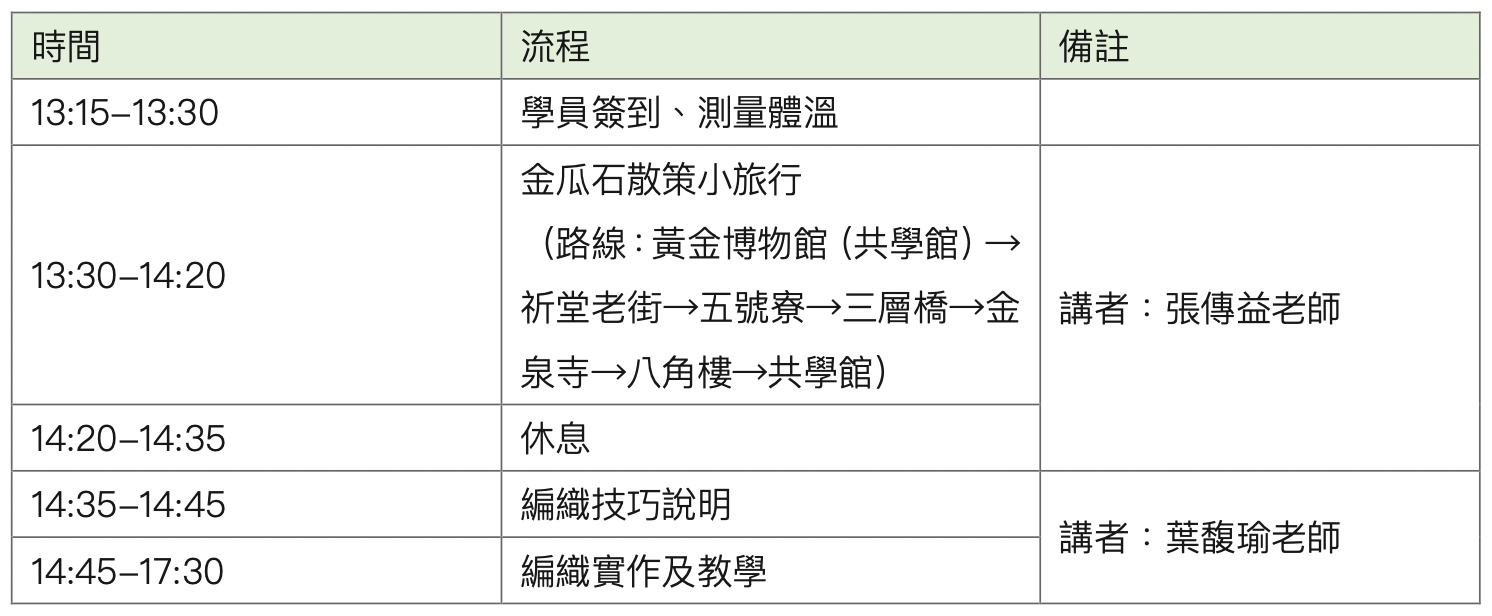 為求導覽及體驗品質,每場次限制15人,因編織課程需要較長的專注力,建議以超過16歲之有興趣民眾一起探索金瓜玩編織!遊程部分安排戶外行程,為顧慮孩童安全,18歲以下孩童需家長一同報名,並全程陪同參加。