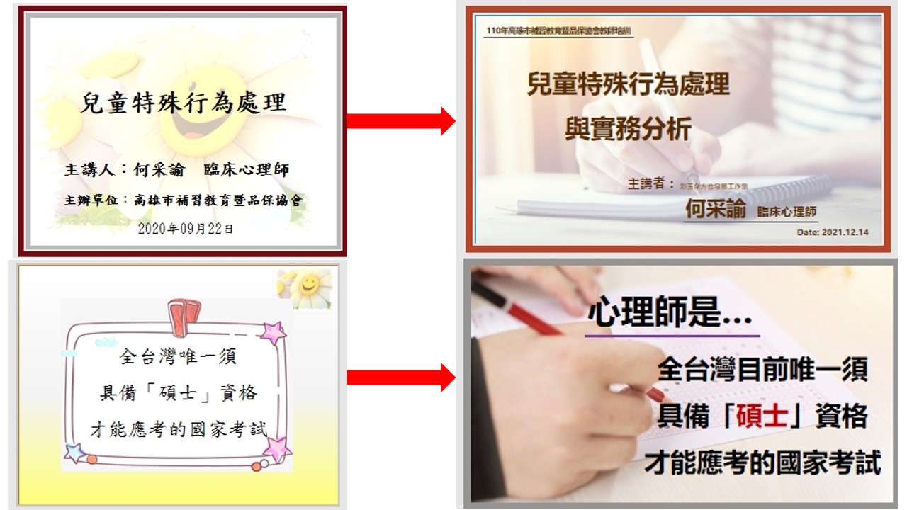 - 受邀演講與授課經驗超過百場:包含上銀科技企訓、三商美邦企訓、中鋼集團、高雄港都客運、『佳謚、大左營、登美牙醫診所』、高雄牙醫師公會、